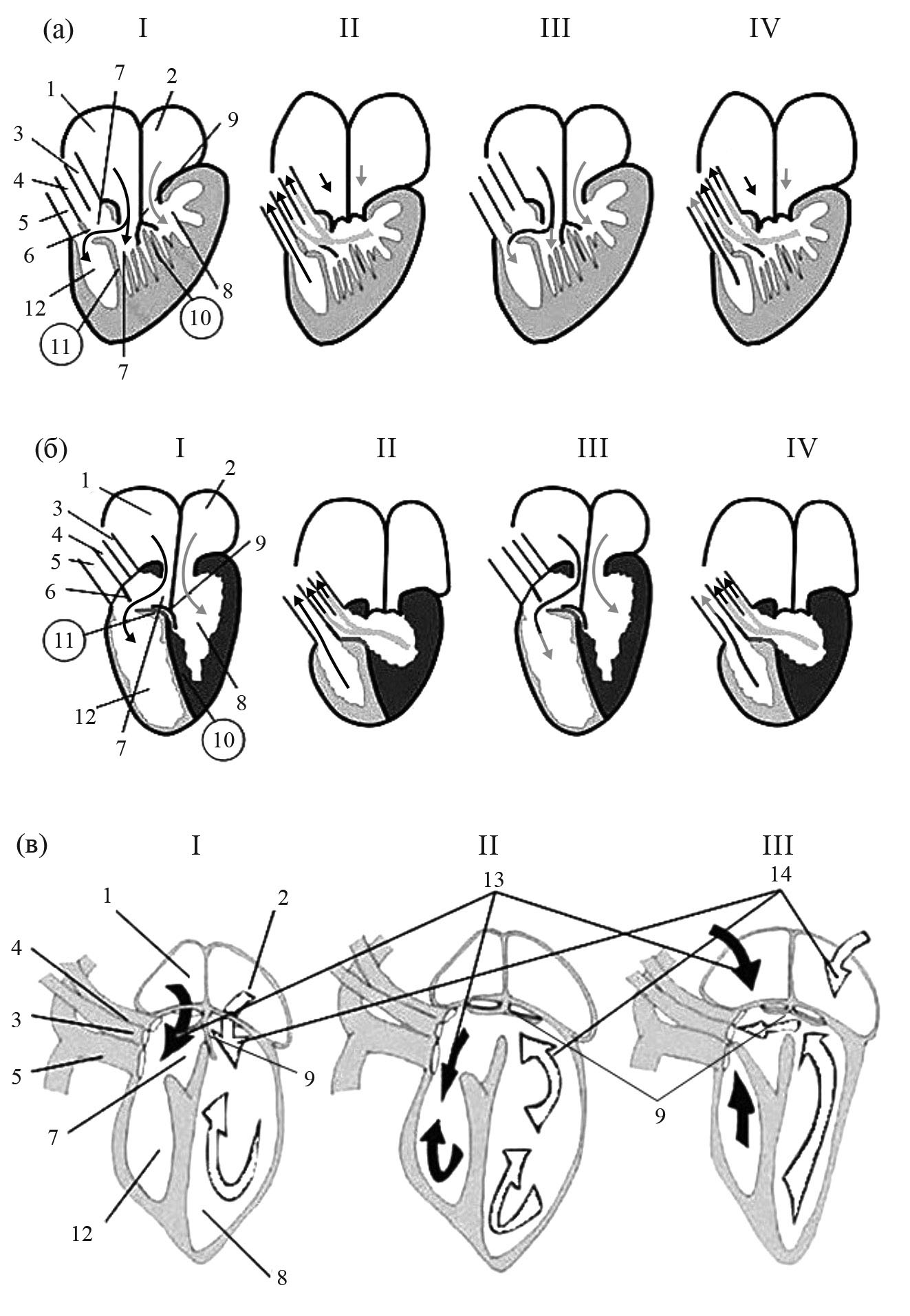 Рис. 4. Упрощенная схема устройства сердца некоторых видов рептилий и кровотока в нем. (а) – большинство чешуйчатых, туатары и черепахи; (б) – питоны (по: Jensen et al., 2014). Трабекулы в артериальной (8) и легочной (12) камерах желудочка у большинства чешуйчатых и черепах, на самом деле, есть, но на рисунке они стерты, чтобы не мешали пониманию деления желудочка на камеры. Черные тонкие стрелки – деоксигенированная (венозная) кровь, серые широкие стрелки и части стрелок (в рисунках под номером II и IV) – оксигенированная (артериальная) кровь. I – первая диастола, II – первая систола, III – вторая диастола, IV – вторая систола. 1 – правое предсердие, 2 – левое предсердие, 3 – правая дуга аорты, 4 – левая дуга аорты, 5 – легочная артерия, 6 – бульбовидная перегородка, 7 – венозная камера, 8 – артериальная камера, 9 – атриовентрикулярный клапан, 10 – вертикальная перегородка, 11 – мускульный гребень, 12 – легочная камера, 13 – деоксигенированная, венозная кровь, 14 – оксигенированная, артериальная кровь; (в) – схема устройства и работы функционально четырехкамерного сердца королевского питона Python regius (по: Starck, 2009; Bogan, 2017). I – ранняя диастола. Деоксигенированная кровь поступает из правого предсердия в венозную камеру. Насыщенная кислородом кровь поступает из левого предсердия в артериальную камеру. Створки атриовентрикулярных клапанов перекрывают внутрижелудочковый канал, предотвращая смешение оксигенированной и деоксигенированной крови. II – поздняя диастола. Атриовентрикулярные клапаны закрываются, и насыщенная кислородом кровь поступает из венозной камеры в легочную. III – систола желудочков. Деоксигенированная кровь поступает из легочной камеры наружу через легочную артерию. Насыщенная кислородом кровь поступает из артериальной камеры через венозную камеру и выходит как через левую, так и через правую аорты. При такой структуре условно пятикамерное сердце питонов оказывается не морфологически, а функционально четырехкамерным.