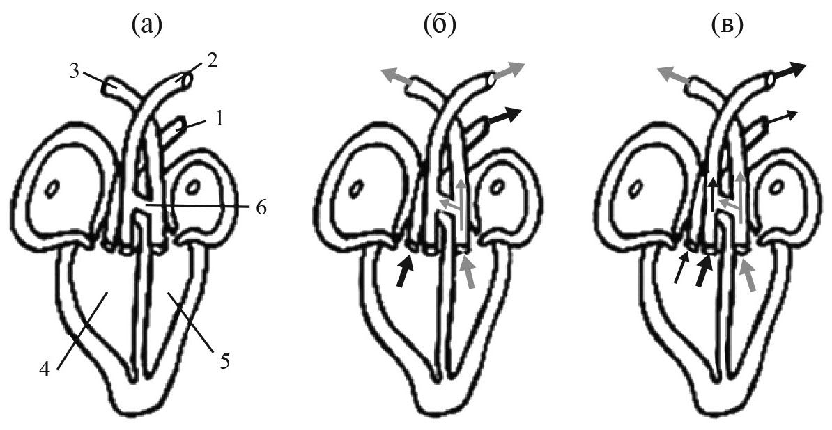Рис. 5. Схема устройства и работы полностью морфологически четырехкамерного сердца крокодила (по: Benton, 2020). Черные стрелки – венозная кровь, серые – артериальная. (а) – анатомия сердца, (б) – циркуляция крови на суше, (в) – циркуляция крови при нырянии. 1 – легочная артерия, 2 – левая дуга аорты, 3 – правая дуга аорты, 4 – правый желудочек, 5 – левый желудочек, 6 – отверстие Паниццы.