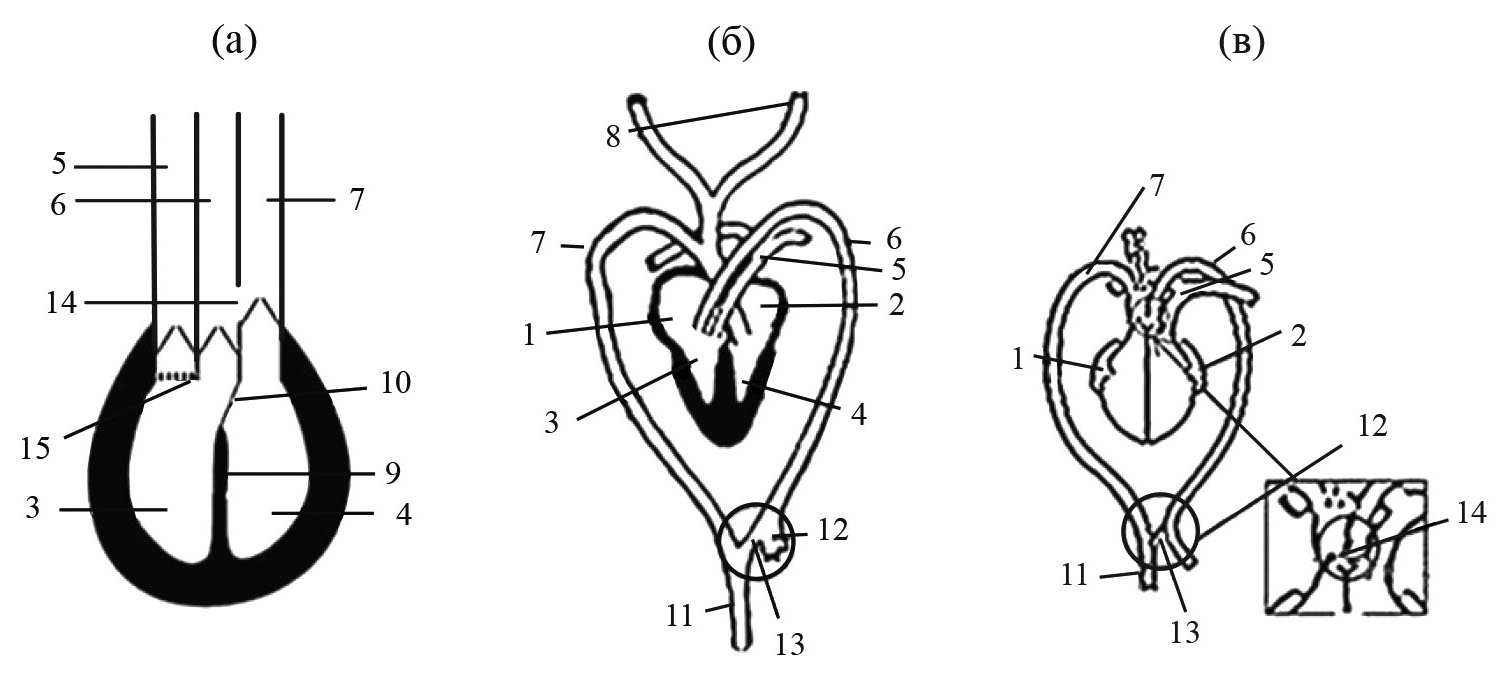 Рис. 6. Схема шунтов и клапанов, обеспечивающих смешивание двух потоков крови и регуляцию степени ее смешивания, у крокодилов. (а) – по: Seymour et al., 2004; (б) – по: Boas, 1884; Полежаев, Шимкевич, 1891; Шмальгаузен, 1947; (в) – по: Grigg et al., 2022. 1 – правое предсердие, 2 – левое предсердие, 3 – правый желудочек, 4 – левый желудочек, 5 – легочная артерия, 6 – левая дуга аорты, 7 – правая дуга аорты, 8 – сонные артерии, 9 – межжелудочковая перегородка, 10 – перепончатая перегородка, 11 – спинная аорта, 12 – чревная артерия, 13 – внесердечный шунт, 14 – отверстие Паниццы (внутрисердечный шунт), 15 – зубчатый клапан.
