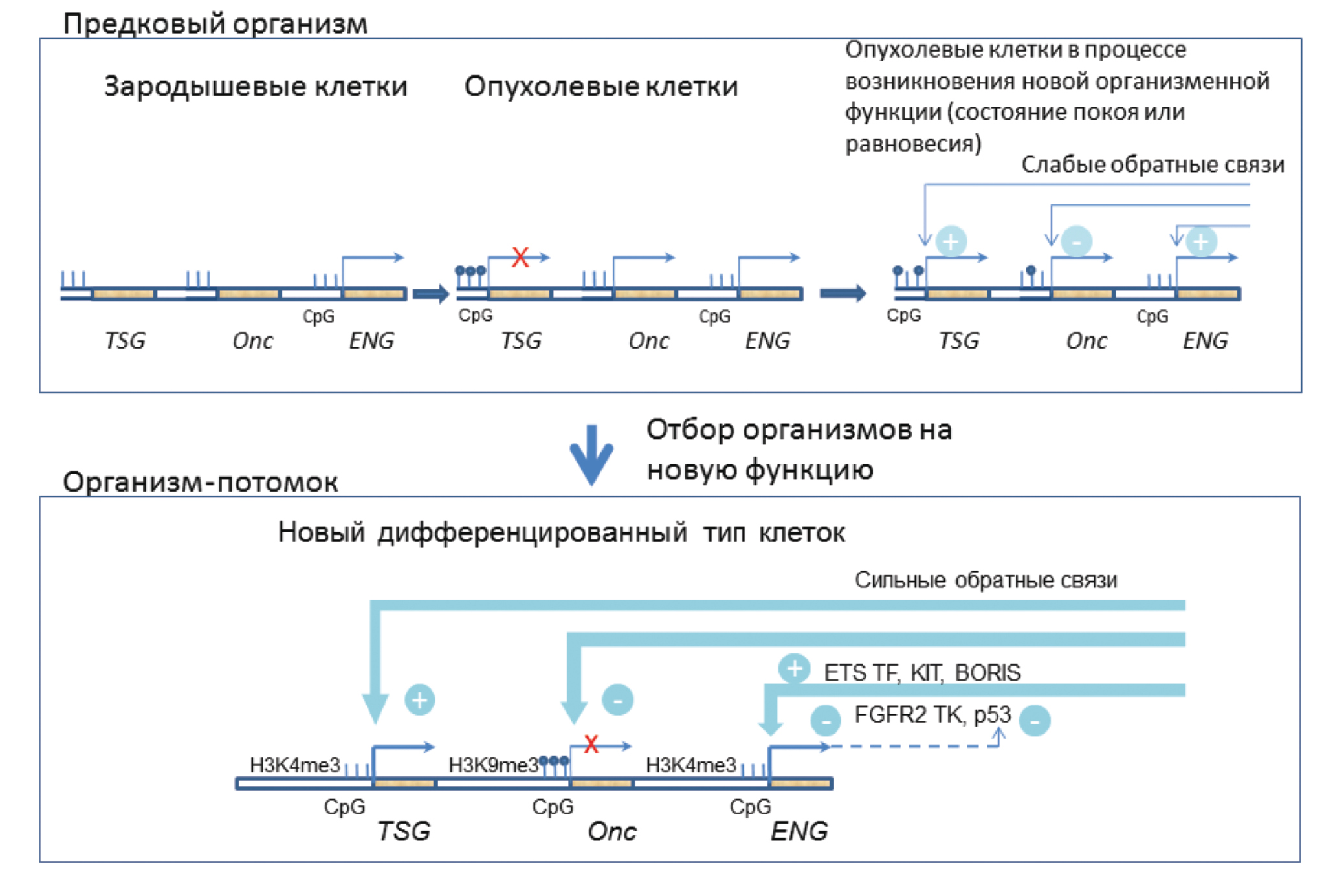 Гипотеза эволюции путем неофункционализации наследуемых опухолей может быть представлена в виде диаграммы (рис. 1).