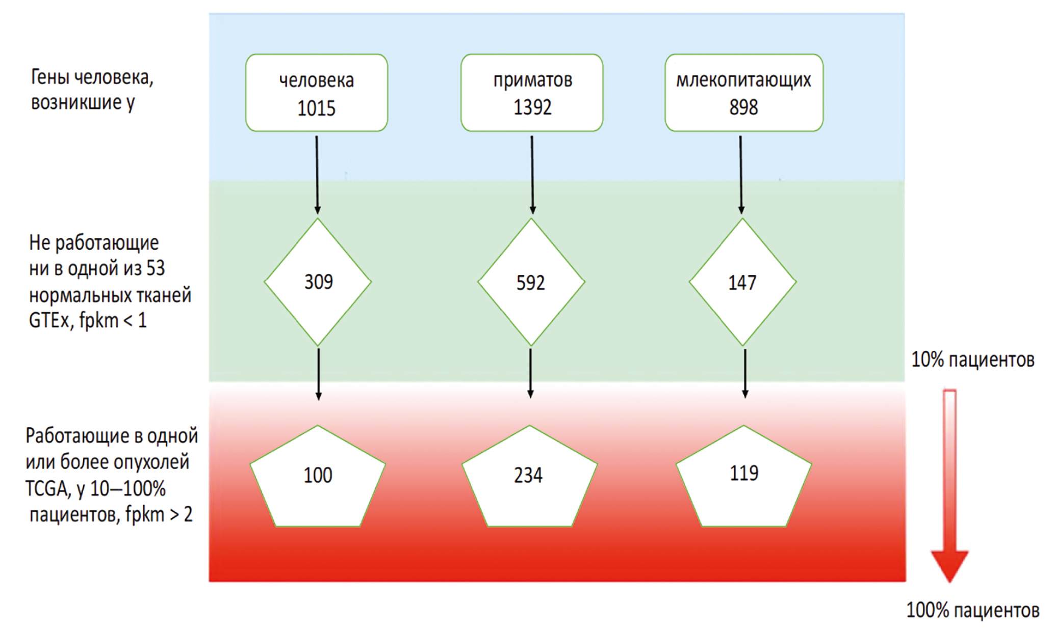 - Эволюционно новые и эволюционно молодые гены должны экспрессироваться специфически или преимущественно в опухолях (tumor specifically expressed, evolutionarily novel (TSEEN) genes).