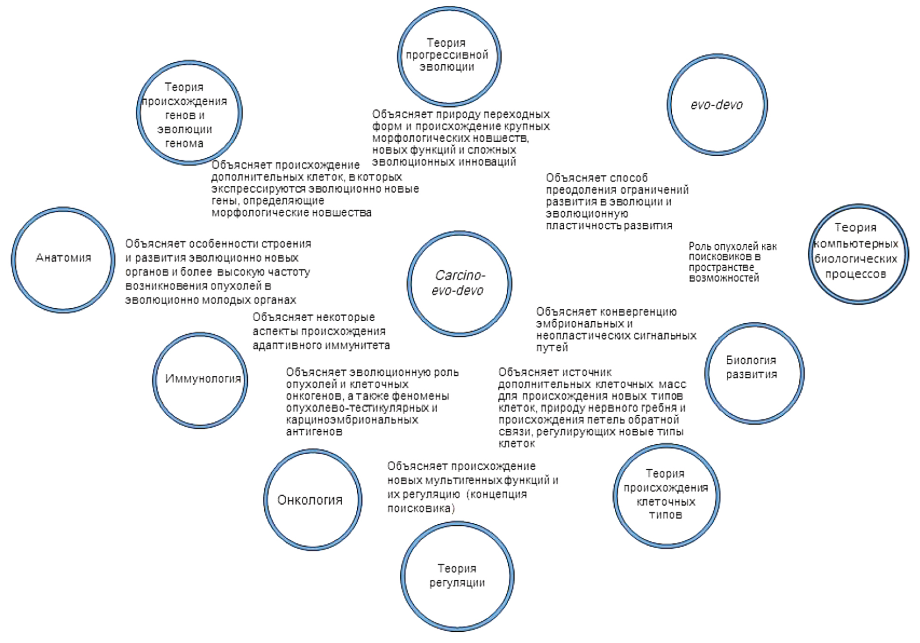Теория carcino-evo-devo состоит из нескольких взаимосвязанных разделов (табл. 1).
