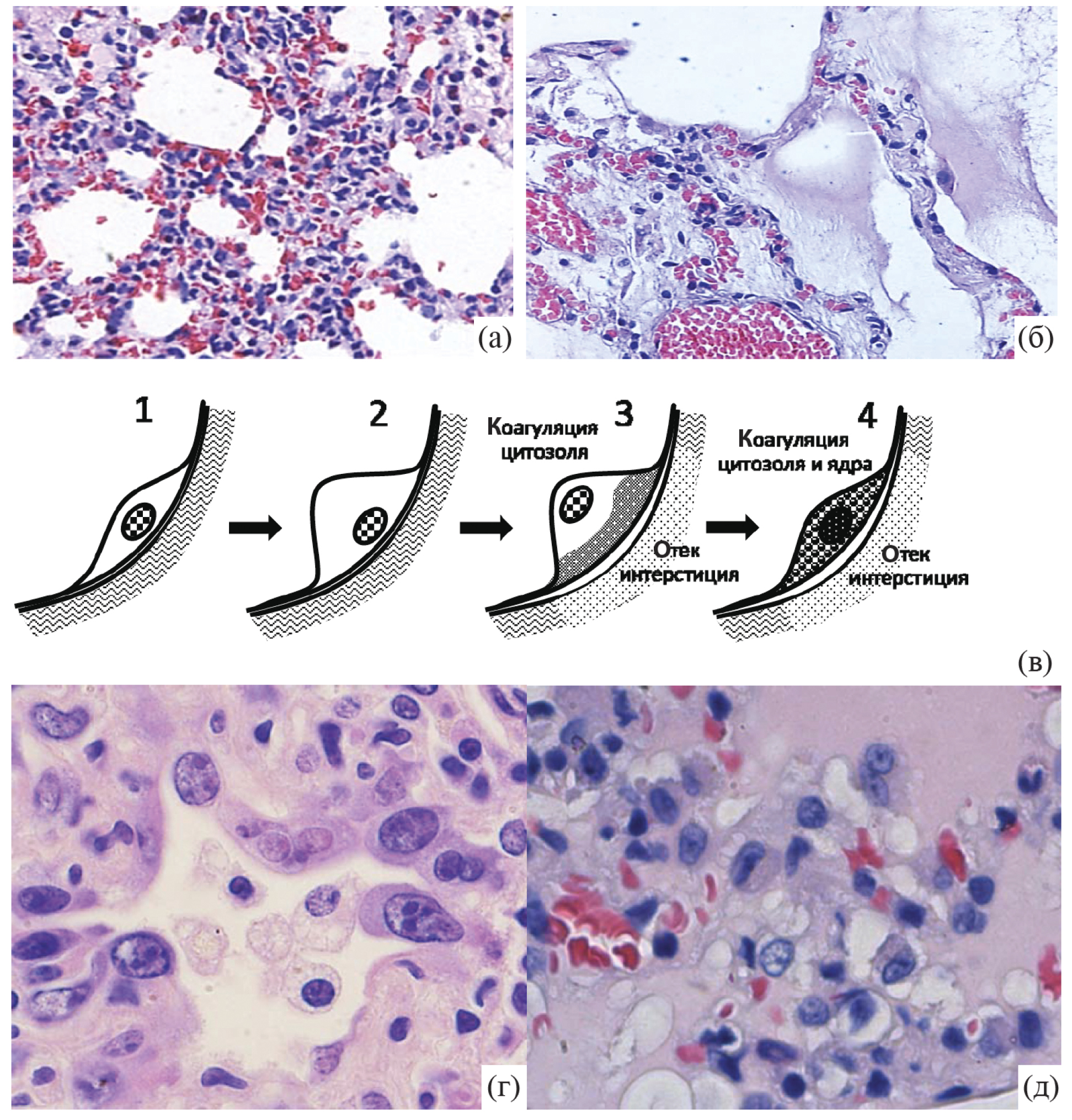 Окраска гематоксилин-эозин. (а) — полнокровие капилляров перегородок, пролабирующих в просвет альвеол (об. ×20); (б) — полнокровие венозных сосудов с набуханием перегородок и пропотеванием белоксодержащей жидкости в просвет альвеол (об. ×40); (в) — стадийные изменения респираторного альвеолоцита вследствие коллоидно-осмотического состояния цитозоля и подлежащей соединительной ткани; (г) — изменения мембраносвязанных и просветных клеток эпителия альвеолы и макрофагов (об. ×100); (д) — кариорексис в эндотелиальных клетках и инфильтрация перегородки полиморфноядерными лейкоцитами, участвующими в резорбции альвеолярного выпота (об. ×100).