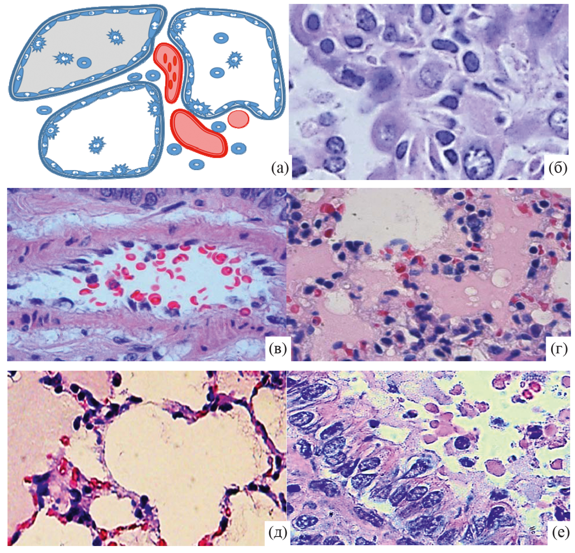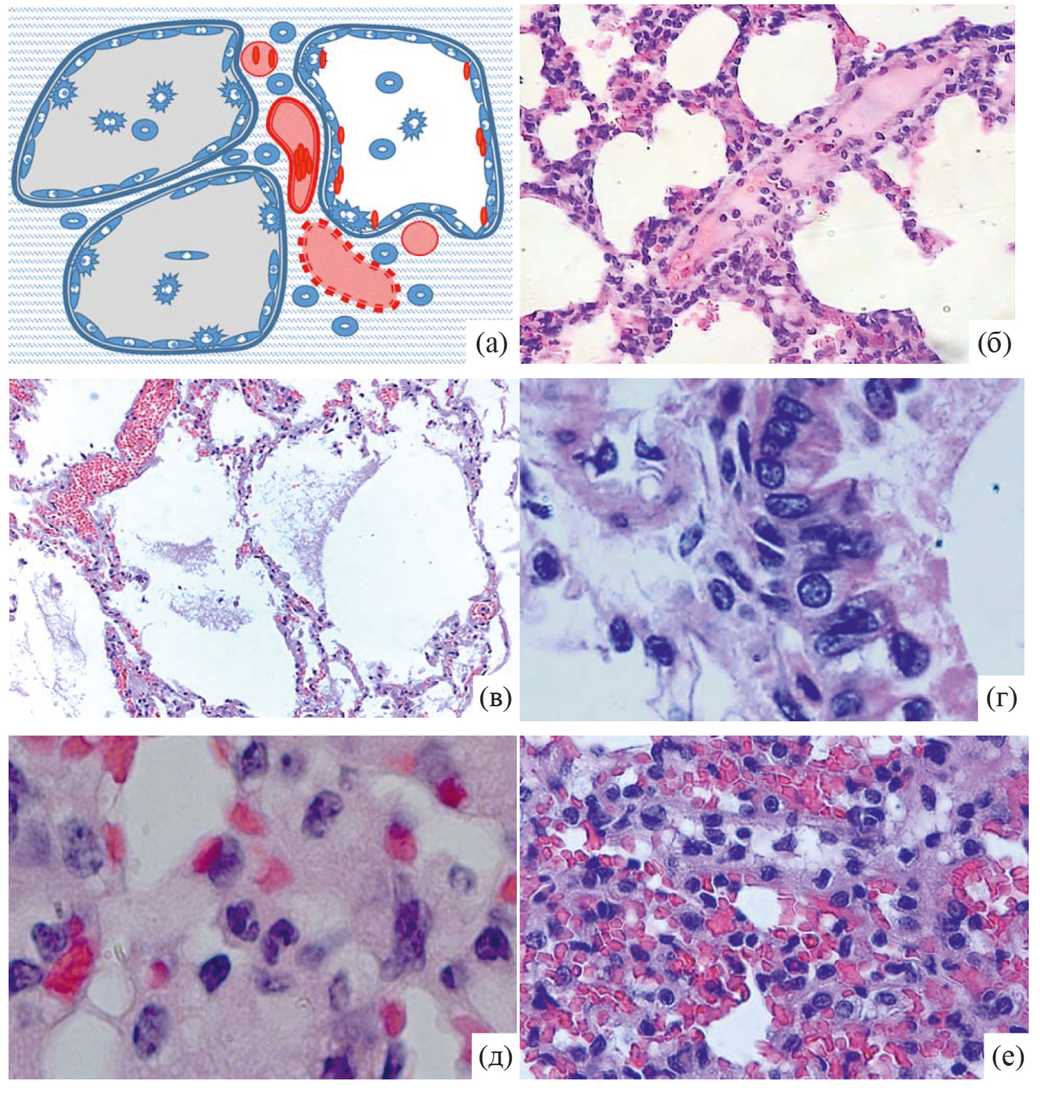 Окраска гематоксилин-эозин. (а) — схема формирующихся гистопатологических изменений (пояснения в тексте); (б) — плазмалемальные септальные венулы (об. ×40); (в) — расширение просветов альвеол с резорбируемым белковым выпотом при полнокровии частично тромбированных септальных сосудов (об. ×20); (г) — дистрофические изменения эпителия бронха с апикальным некрозом, с отторжением части цитозоля клеток и гибелью альвеолоцитов в составе эпителиального пласта (об. ×100); (д) — инфильтрация межальвеолярных перегородок полиморфноядерными лейкоцитами (об. ×100); (е) — микротромбы в капиллярах перегородок и очаги диапедеза эритроцитов в просвет альвеол (об. ×40).