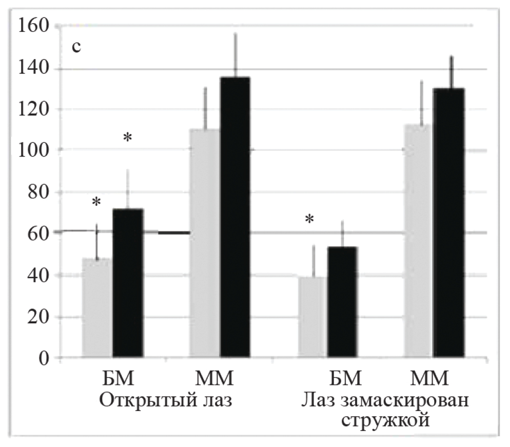 При лазе, замаскированном стружкой, двухфакторный ANOVA показывает достоверное влияние фактора “линия” (F1–2 = 6.7645, p = 0.012), и тенденцию во влиянии фактора “воздействие” (F1–2 = 2.5684, p = 0.089). У мышей БМ в предъявлении теста с лазом, замаскированным стружкой, ЛП перехода в темный отсек камеры после дипептида короче, чем в контроле (тенденция) (после ГК-2 — 61.9 ± 23.1 с, в контроле — 127.1 ± 23.1 с, р = 0.053), тогда как у мышей ММ различия в ЛП недостоверны (после ГК-2 — 130.0 ± 12.5 с, в контроле — 142.6 ± 12.5 с) (рис. 2).