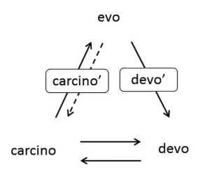 Отсутствие стрелок devo -> evo на carcino-evo-devo диаграммах (a) и (б) является важным запретом: для эволюции развития необходима переходная форма Carcino. Нормальный онтогенез не может эволюционировать из-за ограничений, связанных с развитием (developmental constraints) (Kozlov, 2019).