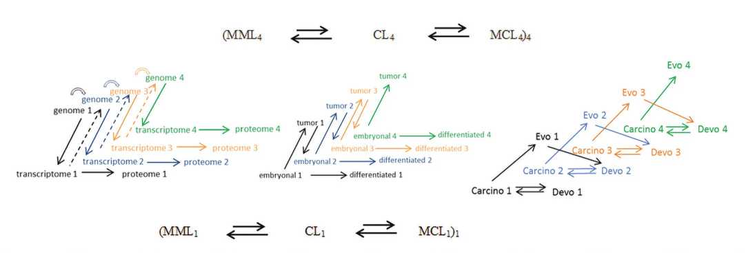 В (Kozlov, 2023b) мы предложили формулу увеличения сложности организмов в прогрессивной эволюции, полученную с использованием диаграмм carcino-evo-devo и преобразованной диаграммы центральной догмы молекулярной биологии, развернутой в эволюционном измерении. Таким образом, был сделан шаг вперед на пути формализации закономерностей увеличения биологической сложности в прогрессивной эволюции с использованием аппарата математической теории категорий.
