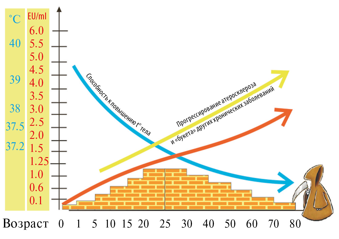 Рис. 1. Возрастное увеличение содержания ЛПС в кровотоке при снижении способности организма повышать температуру тела сопровождается прогрессирующим течением хронических заболеваний и ростом их числа (Яковлев, 2021). По оси абсцисс: возраст, лет. По оси ординат: температура тела (°С) и концентрация эндотоксина (EU/ml).