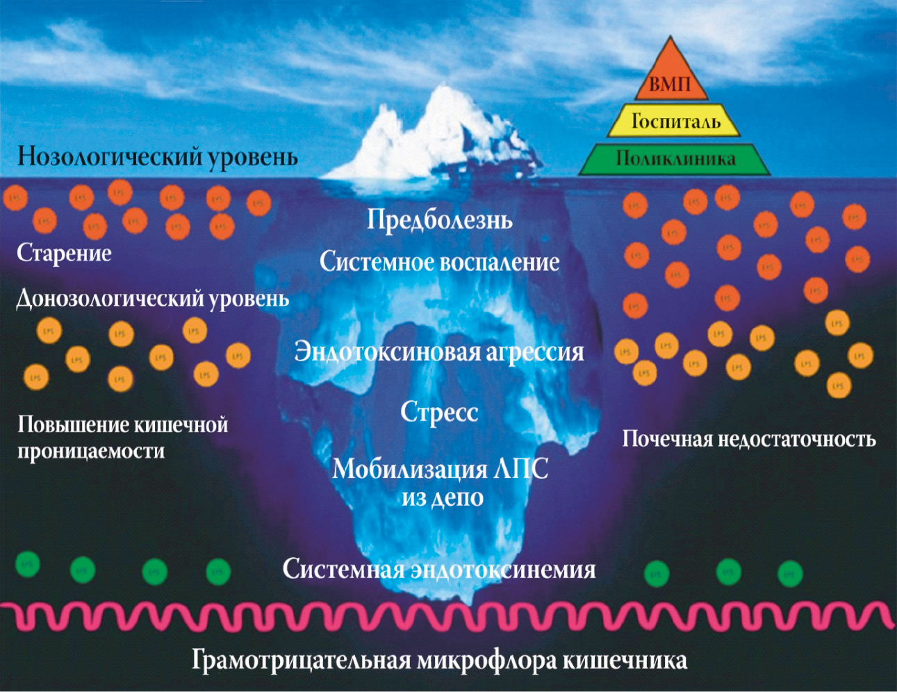 Рис. 5. Универсальная роль системной эндотоксинемии в адаптации, индукции системного воспаления, патогенезе заболеваний и старения (Яковлев, 2021) в авторской модификации. ВМП — высокотехнологическая медицинская помощь.