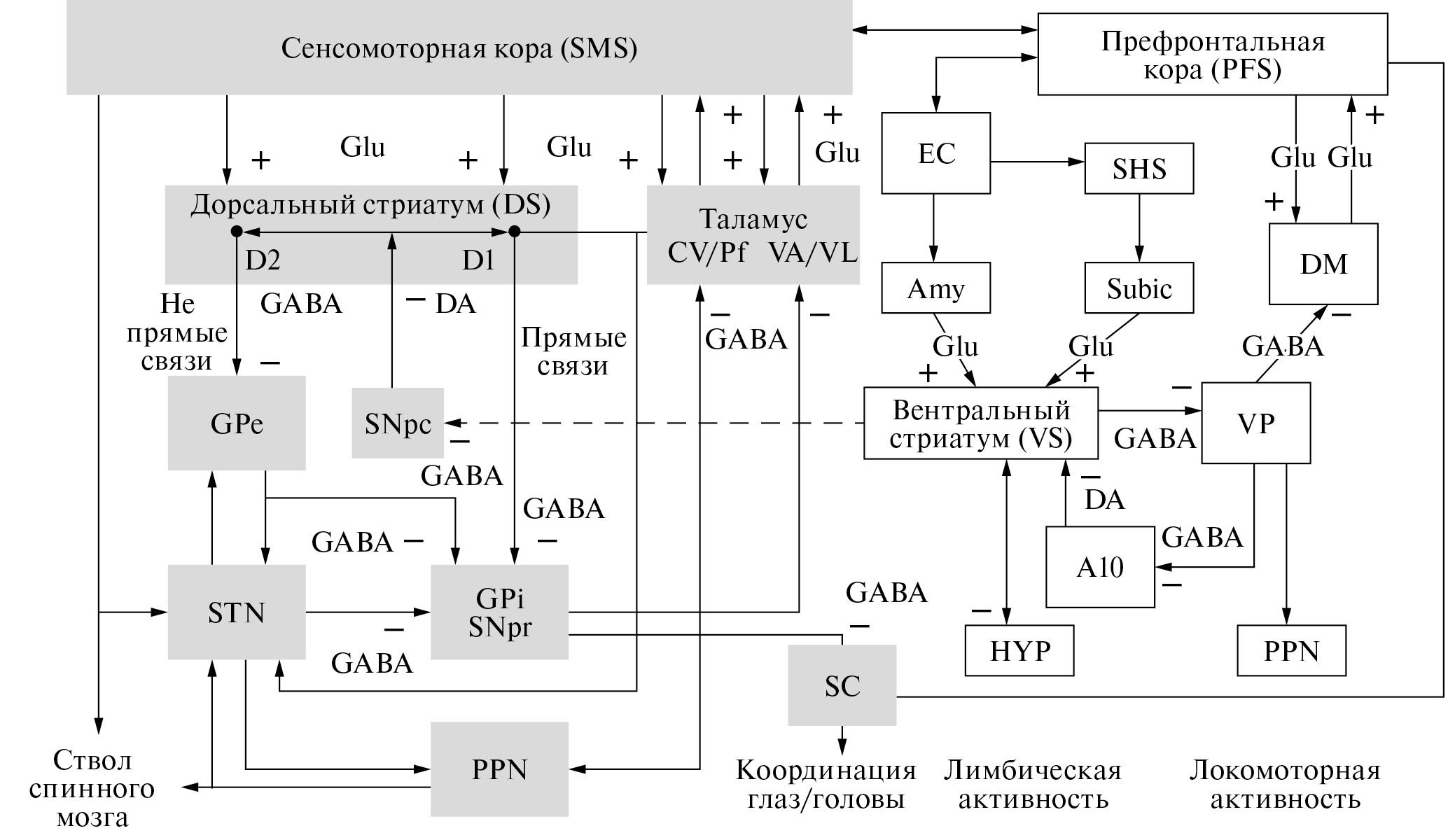 Нейрональные структуры дорсального (“моторного”) отдела стриатума для отличия от структур вентрального (“лимбического”) стриатума на схеме выделены тоном. Пунктирной линией отмечены кратчайшие нейрональные проекции между вентральным и дорсальным отделами стриатума. SMC (sensorimotor cortex) — сенсомоторная кора; DS (dorsal striatum) — дорсальный стриатум (каудатопутамен); GPe (outer segment of the globus pallidus) — внешний сегмент бледного шара; GPi (inner segment of the globus pallidus) — внутренний сегмент бледного шара; VA/VL (ventral anterior and ventral lateral nuclei of the thalamus) — вентральное переднее и вентральное латеральное ядра таламуса; CM/Pf (centromedian-parafascicular) — комплекс из интраламинарных ядер таламуса; STN (subthalamus) — субталамус; SNpc (compact part of substantia nigra) — компактная область черной субстанции; SNpr (reticular part of substantia nigra) — ретикулярная область черной субстанции; PPN (pedunculopontine nucleus) — ножково-мостовое ядро; PFC (prefrontal cortex) — префронтальная кора; VS (ventral striatum) — вентральный стриатум (прилежащее ядро); EС (entorhinal cortex) — энторинальная кора; SHS (septohippocampal system) — септо-гиппокампальная система; Subic (subicular region of the hippocampus) — субикулярная область гиппокампа; Amy (amygdala) — амигдала; DM (dorsomedial nucleus of the thalamus) — дорсомедиальное ядро таламуса; VP (ventral pallidum) — вентральный паллидум; A10 (A10 of the ventral tegmental area) — отдел А10 вентральной тегментальной области (VTA); SC (superior colliculi of the corpora quadrigemina) — верхние бугорки четверохолмия; HYP (hypothalamus) — гипоталамус; DA (dopamine) — дофамин; GABA (γ-aminobutyric acid) — гамма-аминомасляная кислота; Glu (glutamate) — глутамат.