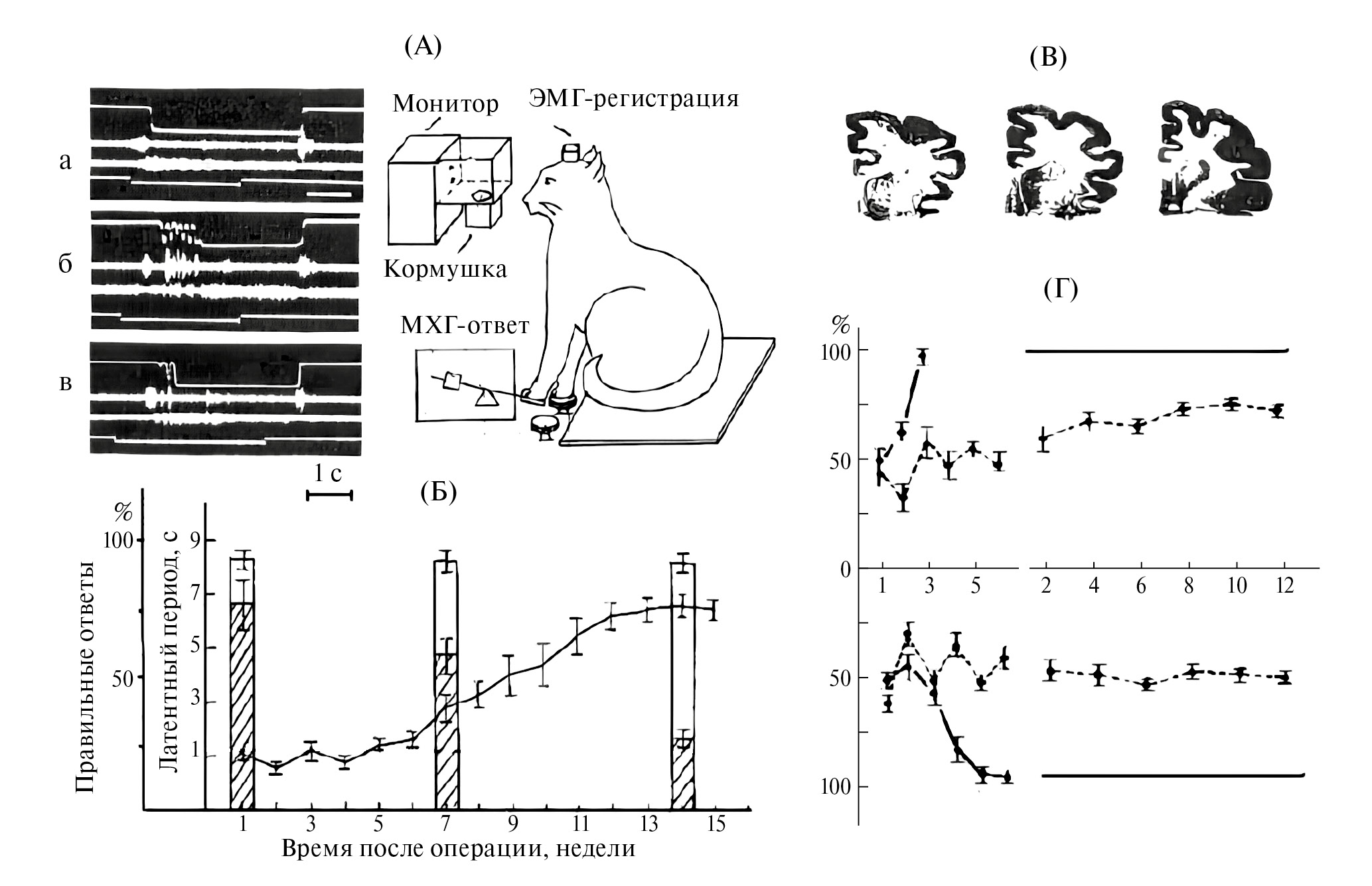 Рис. 2. (А) Влияние каудатэктомии на реализацию инструментальных пищевых рефлексов: а – правильное чередование положительных и тормозных раздражителей; б – предъявление раздражителей в случайном порядке; в – то же через 2–3 месяца после каудатэктомии. (Б) Изменение латентного периода инструментальных реакций при предъявлении положительных и тормозных раздражителей в случайном порядке в различные послеоперационные сроки. По оси абсцисс — срок после операции, недели. По оси ординат — величина латентного периода, с. (В) Локализация повреждения дорсального отдела стриатума. (Г) Выработка двигательного рефлекса у каудатэктомированных животных при стереотипном (вверху) и рандомизированном (внизу) чередовании сигналов (по: Альбертин, 2011, 2015). По оси абсцисс – время выработки (дни, недели). По оси ординат – % правильных ответов.