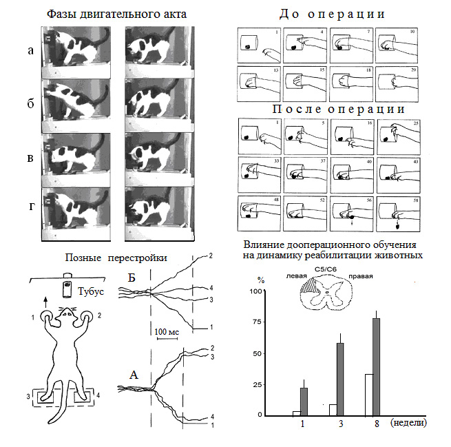 Послеоперационное тестирование всех подопытных животных проводили ежедневно в течение 8 недель. Анализировали число правильных ответов, время осуществления пищедобывательной реакции, а также фиксировали характер и выраженность двигательных нарушений после повреждения кортико- и руброспинального эфферентных путей.