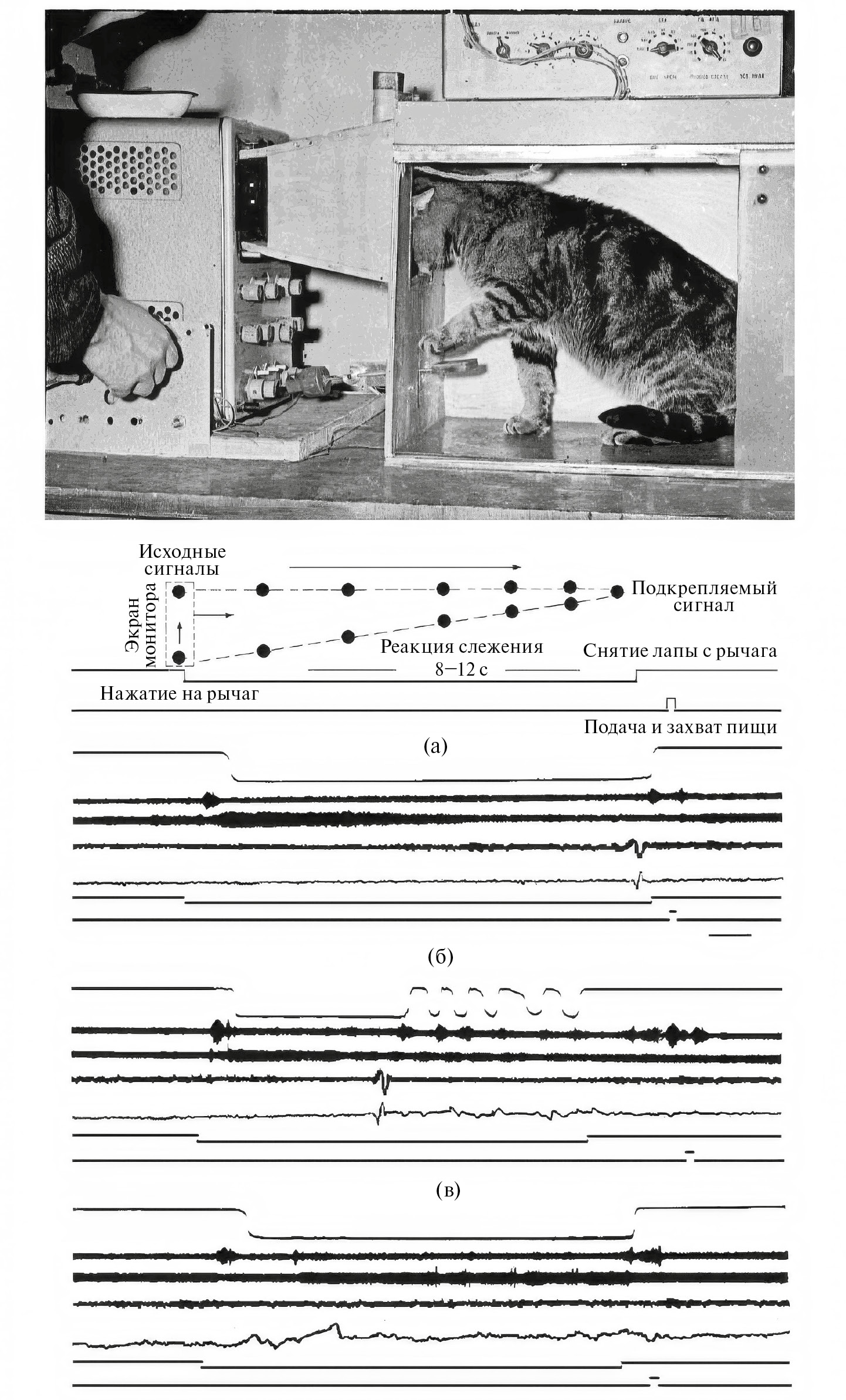 При оценке успешности выполнения поведенческих задач учитывали сложность теста, общее количество применяемых проб, число проб с правильными ответами, время выполнения задачи сведения раздражителей в целевой сигнал. При этом анализировали электромиограммы мышц-антагонистов рабочей лапы, осуществляющей целенаправленный двигательный ответ, шейных мышц, фиксирующих фазические движения головы, электроокулограмму, механограмму и тензограмму тонического и фазического компонентов двигательных реакций, которые показывают динамику и характер условно-рефлекторного поведения, а также силу нервной системы и подвижность нервных процессов животного при выполнении тестируемой задачи.