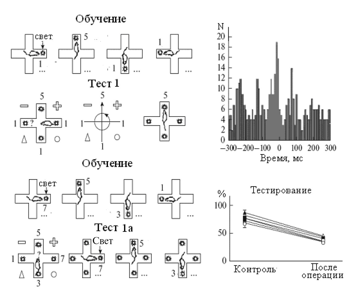 Рис. 5. Выбор подопытными животными предпочитаемого подкрепления в лабиринте с дифференцированным подкреплением при одновременном включении локальных зрительных сигналов во всех рукавах радиального лабиринта — Тесты 1 и 1a (Альбертин, 2021; Albertin et al., 2000; Tabuchi et al., 2003; Albertin, Wiener, 2015). Цифры на рисунке — количество капель подкрепления в рукавах лабиринта. Кружки со стрелками — направление обзора животного при определении локализации предпочитаемого подкрепления в лабиринте с помощью экстралабиринтных навигационных сигналов. Справа сверху — кросскоррелограмма синхронной нейронной активности в тета-диапазоне прилежащего ядра и гиппокампа, регистрируемой при выборе предпочитаемого (наибольшего) подкрепления. Справа внизу — уровень правильных ответов при выборе наибольшего подкрепления до и после повреждения вентрального стриатума (n. accumbens).