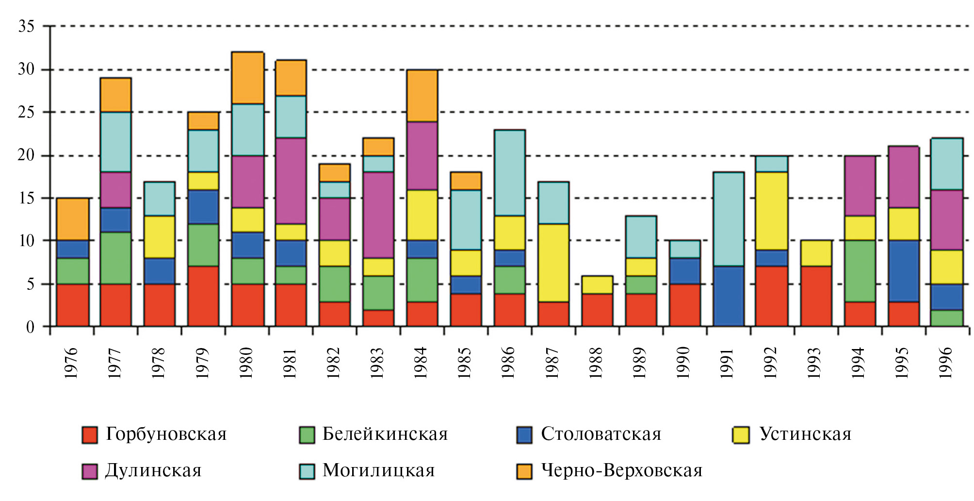 Наличие выводка в той или иной семье устанавливали вначале методом идентификации размера отпечатка передней правой стопы волка по гипсовым слепкам родительских пар. Затем методом подвывки, опроса охотников, местного населения подтверждались данные о выводке. В снежный период методом тропления определяли количественный состав семьи: выделяли родительскую пару и молодых (в ноябре–январе); по количеству постоянных лежек или следам, когда волки идут цепью (на дороге, по насту после снегопада, при подготовке к атаке лося) — число особей в семье. Молодых самцов определяли по характеру мочевой метки. Итоговый результат, отражающий ежегодную динамику количественного размера семей популяционной группировки волка представлен в табл. 1. В анализ включены 147 семей волка, а также учтены сведения по количественному составу 135 стай (семей) волка из Калининской (Тверской) обл., согласно данным районных охотоведов в январе 1980 г.