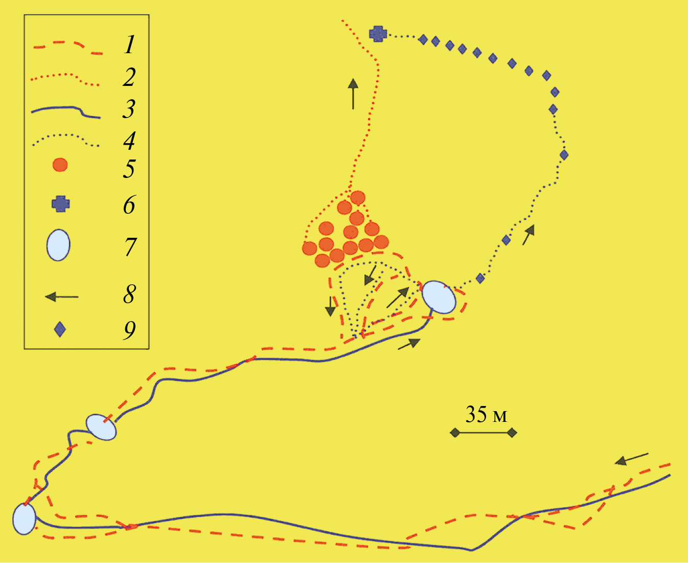 В статье употребляется следующая терминология: взрослый (синоним: матерый, adult ≥ 24 мес.) — старше двух лет, полувзрослый (синоним: переярок, subadult, yearling — 12–23 мес.) — 1–2 года и молодой (синоним: прибылой, juvenis, pup < 12 мес.) — до 1 года (Ballard et al., 1987). В летне-осенний период наличие взрослых самца и самки, полувзрослых и молодых в составе семьи устанавливали по особенностям воя. Вой взрослого самца грубый, басовитый, на “О”, состоит из двух колен: начало и более короткое окончание. Вой взрослой самки более протяжный, нежный, на “У”, состоит из двух колен: одинаковых по продолжительности начала и окончания воя. Вой полувзрослого волка напоминает вой взрослого самца и взрослой самки: первая часть, как у самца, но несколько мягче, вторая часть, как у самки, но на “О”, третья часть похожа на “жевание” звука и состоит из трех колен: подъем, спад, подъем (рис. 1).