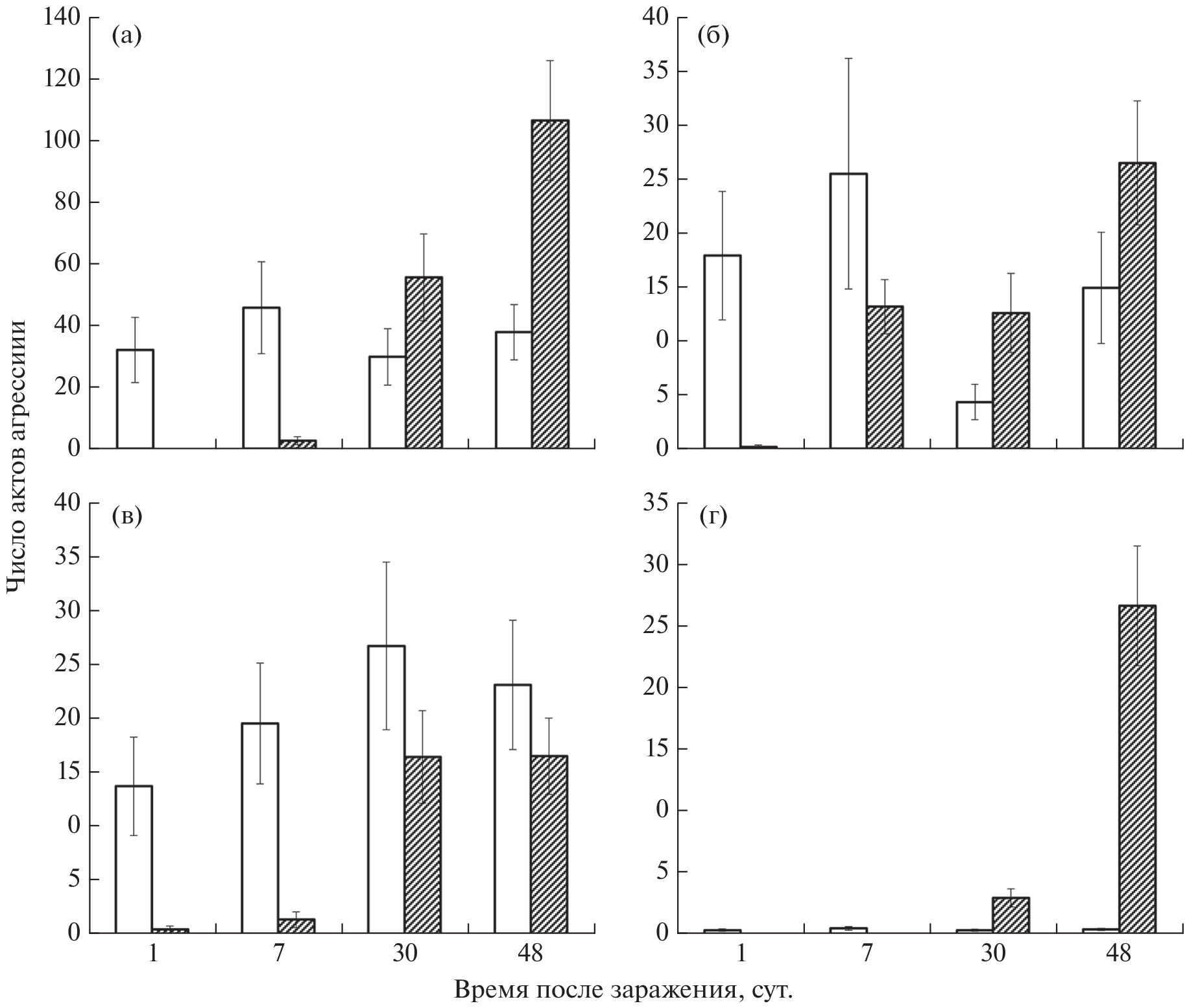 The dynamics of aggressive behavior of the underyearlings of the rainbow trout Oncorhynchus mykiss infected with metacercariae of the trematodes Diplostomum pseudospathaceum has been studied in an experimental heterogeneous environment for 48 days. The fish competed for the dark area of the bottom by charges, biting, chasing, and frontal and lateral displays. The sharply increased aggressiveness of fish when the parasites became infective (1.0–1.5 months after infection), i.e., capable of infecting the final host (piscivorous birds), manifested itself in an increased frequency of bites (more than 20 times compared to the control) and charges (almost three times) and was accompanied by fast movements, sharp maneuvers, and low ability to compete for shelters. The share of comparatively slow displays and chasing was much smaller. The strategy of D. pseudospathaceum manipulation of fish behavior consists of two stages: (1) protecting the host from predators; (2) increasing the vulnerability of the host. At the first stage, the general level of aggression decreases sharply; at the second, on the contrary, aggressiveness rapidly increases, but the ratio of different categories of aggression changes. The share of categories that make the host more vulnerable to predators increases. High activity and low competitiveness of infected fish contribute to their rapid extermination by predators or moving to another habitat. Such migration of fish can increase the fitness of the parasite, facilitating its dispersal in the water body.
