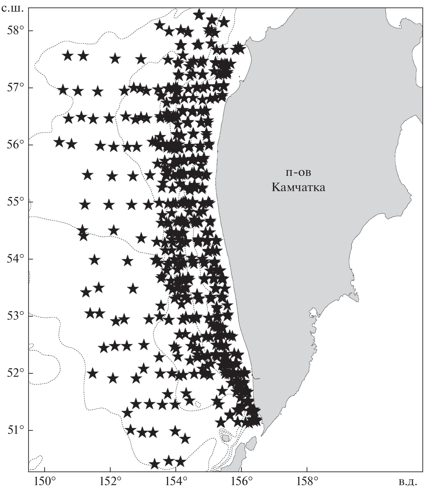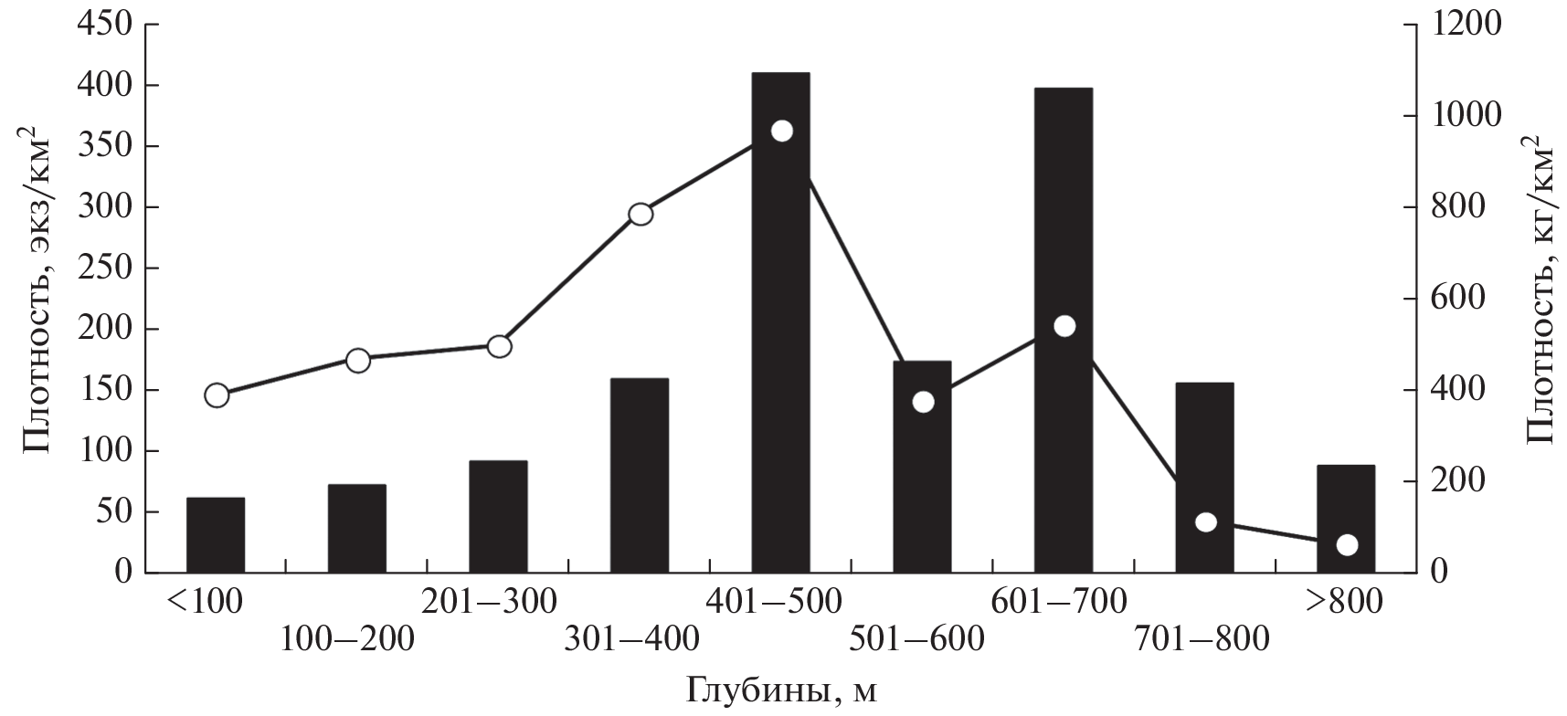 На основании материалов донных траловых съёмок выявлены особенности распределения, термические условия обитания и размерный состав пятнистого ската Bathyraja maculata в северо-восточной части Охотского моря в период гидрологического лета 1998–2019 гг. Основные скопления вида были обнаружены в районе восточного склона впадины ТИНРО севернее 56° с.ш. Область вертикального распространения охватывала глубины 60–874 м. Диапазон температур придонного слоя воды, при котором встречался вид, составлял 0–3.0°С. Высокие значения относительного обилия по численности были характерны для глубин 401–500 и 601–700 м, по биомассе – до 500 м. Молодь пятнистого ската обнаружена у нижней границы обитания (>600 м), а крупные особи заселяли шельф и прилегающие участки материкового склона. Предположительно, на восточном склоне впадины ТИНРО располагается одно из нерестилищ вида.
