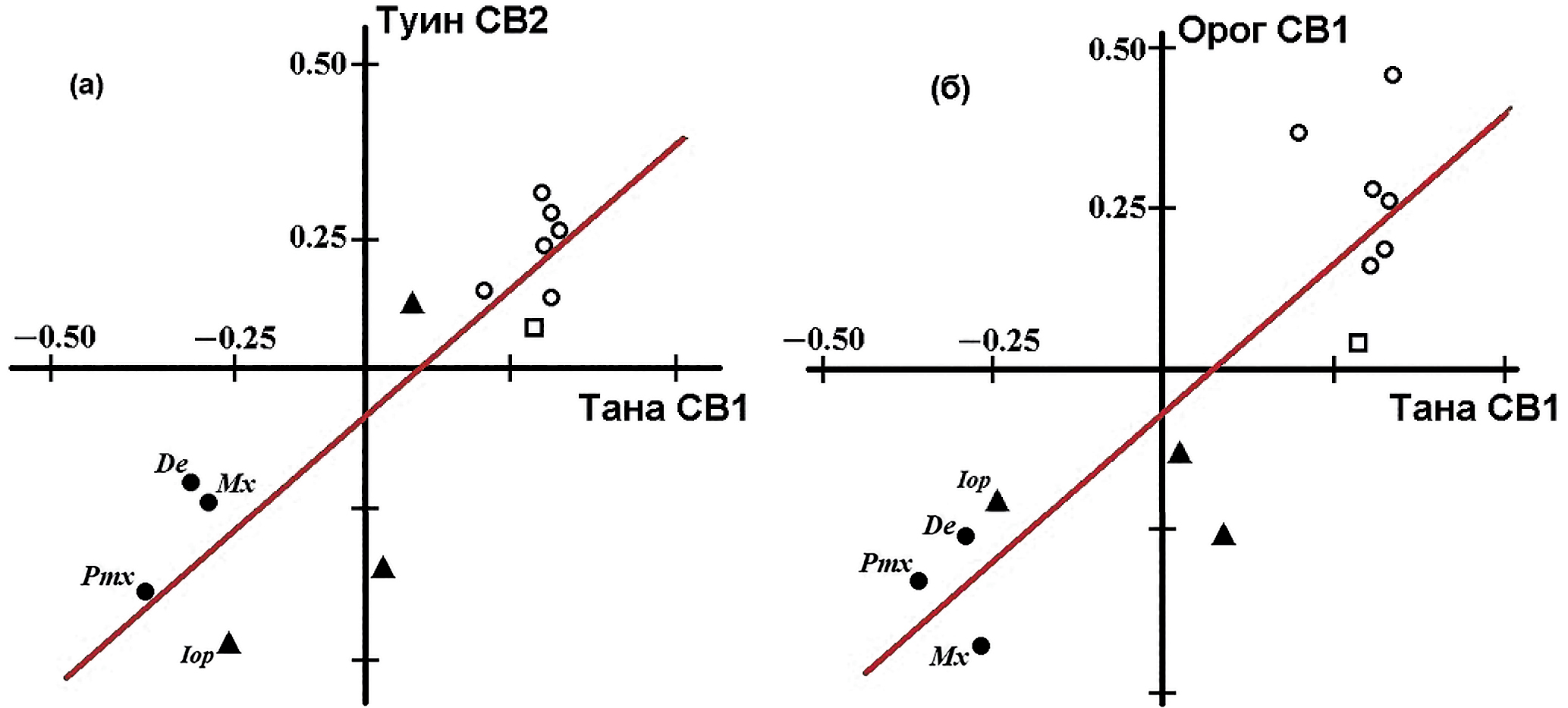 Рис. 4. Сравнение собственных векторов (СВ) дисперсии особей генерализованных форм усачей комплекса Barbus intermedius оз. Тана и алтайского османа Oreoleuciscus humilis водной системы р. Туин и оз. Орог: а – засушливый период, СВ1 оз. Тана и СВ2 р. Туин, rS = 0.83, p < 0.001; б – влажный период, СВ1 оз. Тана и СВ1 оз. Орог, rS = 0.85, p < 0.0001.