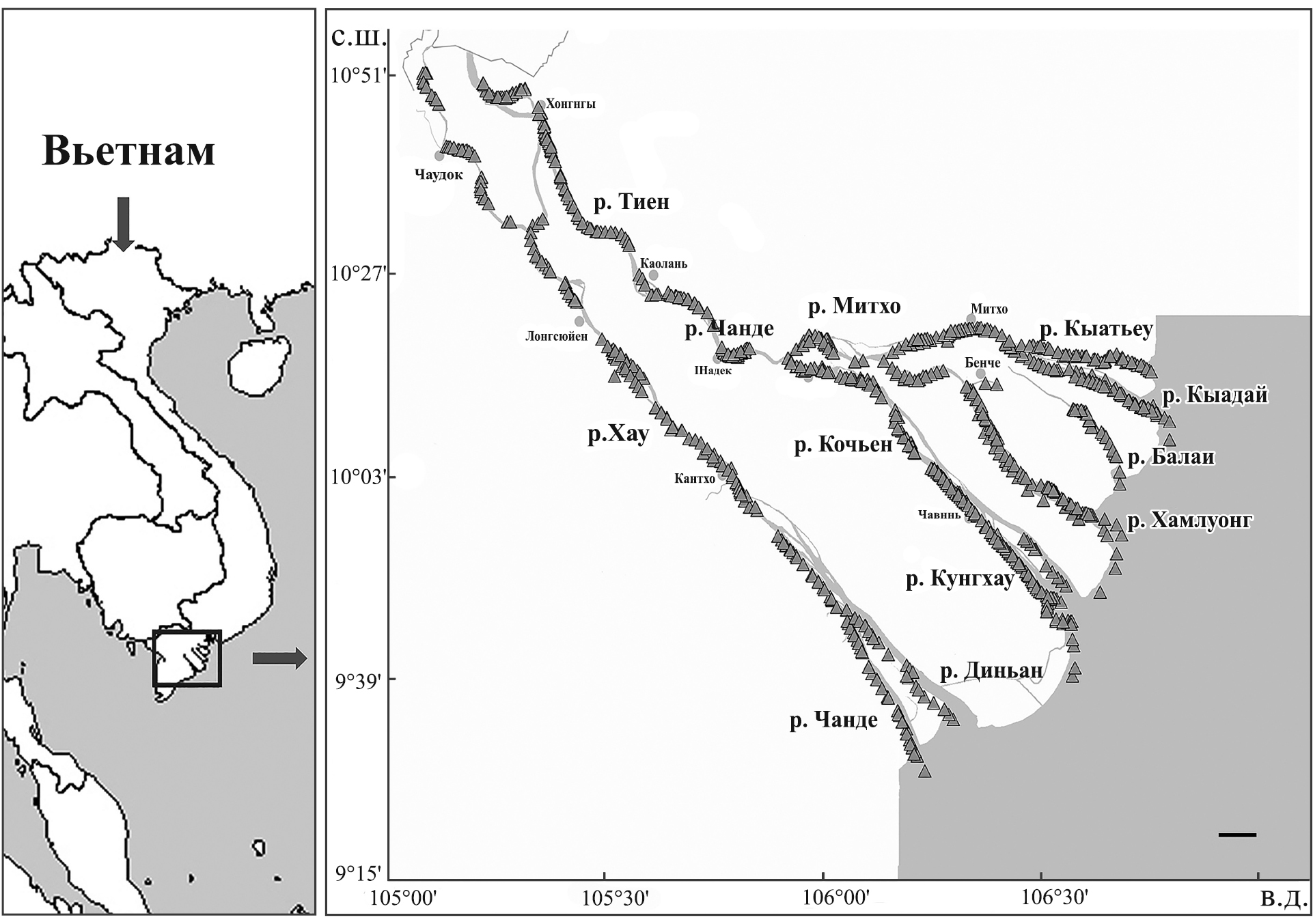 Исследования проводили во Вьетнаме в главных реках и устьевых рукавах системы Меконга, от границы с Камбоджей до приустьевой морской зоны (рис. 1). Сбор материала охватывал как меженный (декабрь–июнь), так и паводковый (октябрь–ноябрь) периоды: апрель–июнь 2018 г., январь–март и октябрь–ноябрь 2019 г.; февраль–март, май–июнь и декабрь 2020 г.; январь, май и декабрь 2021 г., март–апрель и октябрь–декабрь 2022 г. Рыб отлавливали посредством донных тралений бимтралом (ширина рамы 5 м, высота 0.4 м) с траловым мешком длиной 12 м и ячеёй 10 мм.