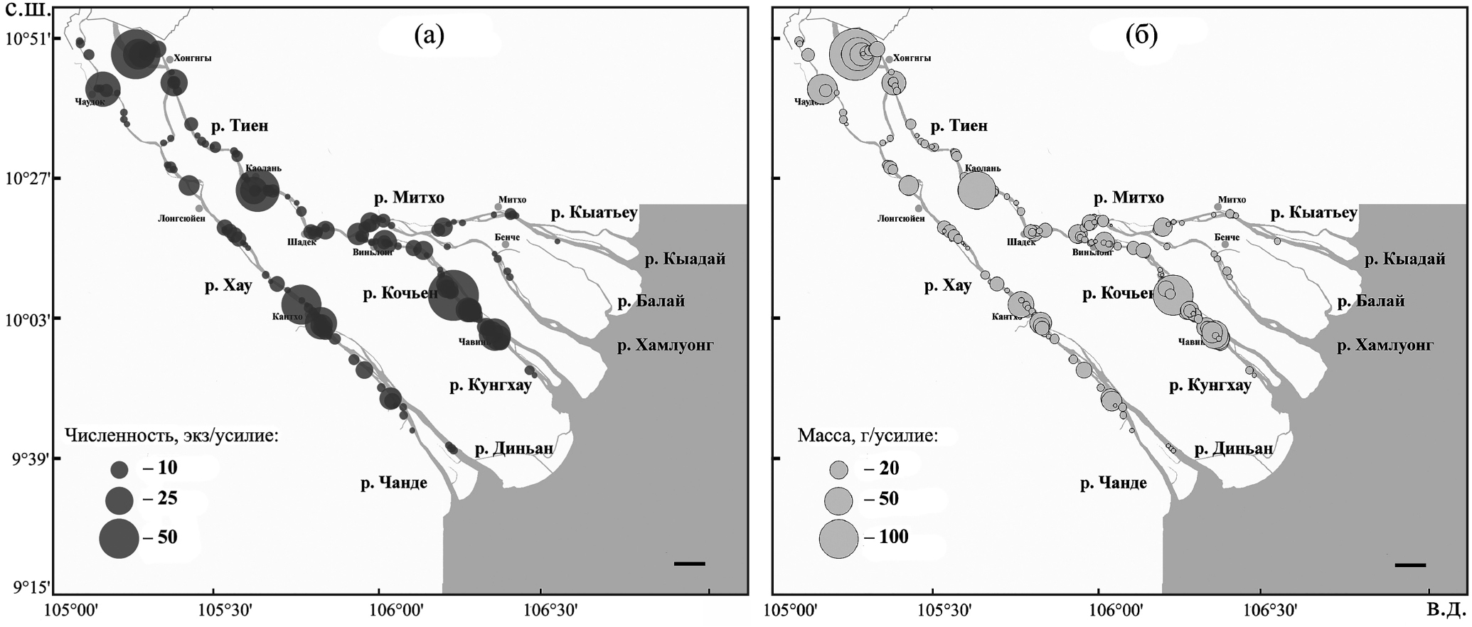 Рис. 3. Пространственное распределение Tonlesapia tsukawakii по численности (а) и массе (б) на промысловое усилие в дельте р. Меконг.