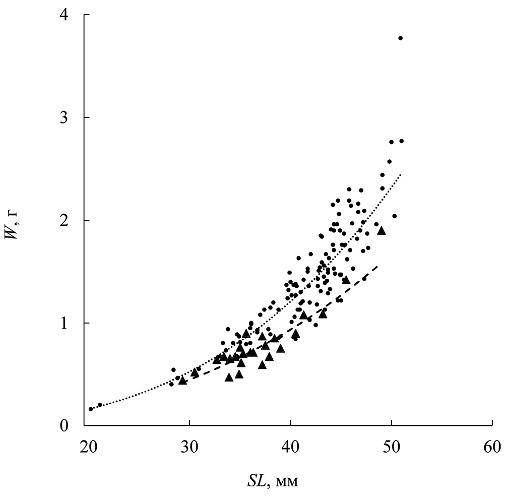 Рис. 5. Зависимость массы тела (W) от стандартной длины (SL) самцов (▲) и самок (●) Tonlesapia tsukawakii. Уравнение зависимости для самок: W = 3 × 10−5SL2.9147, R2 = 0.7989; для самцов: W = 7 × 10−5SL2.5876, R2 = 0.8787.