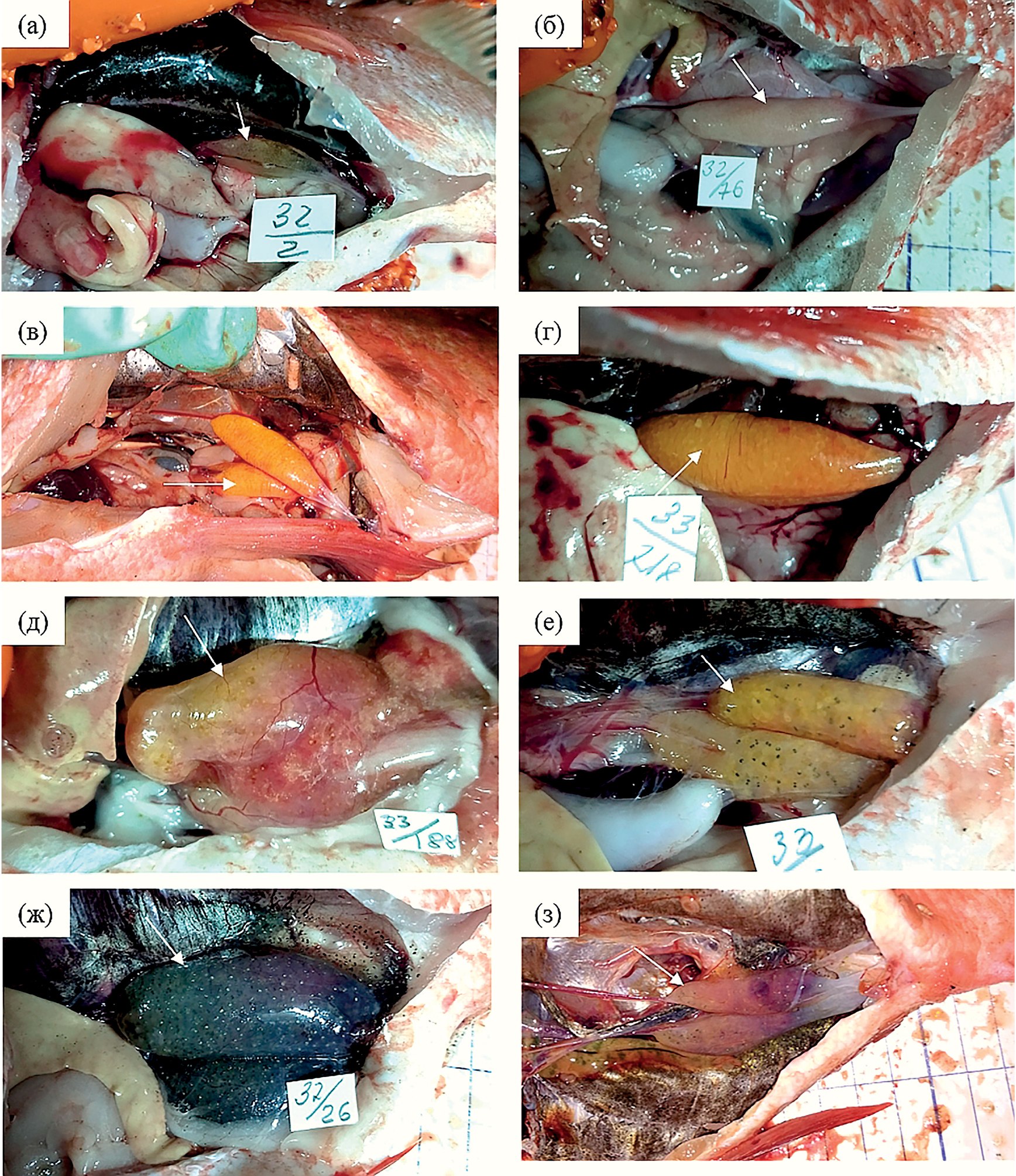 Рис. 1. Яичники тихоокеанского окуня-клювача Sebastes alutus разных стадий зрелости: а – II, б – II–III, в – III, г – IV, д – VI, е – VII, ж – VIII, з – IX–III. Здесь и на рис. 2: (→) – гонады.