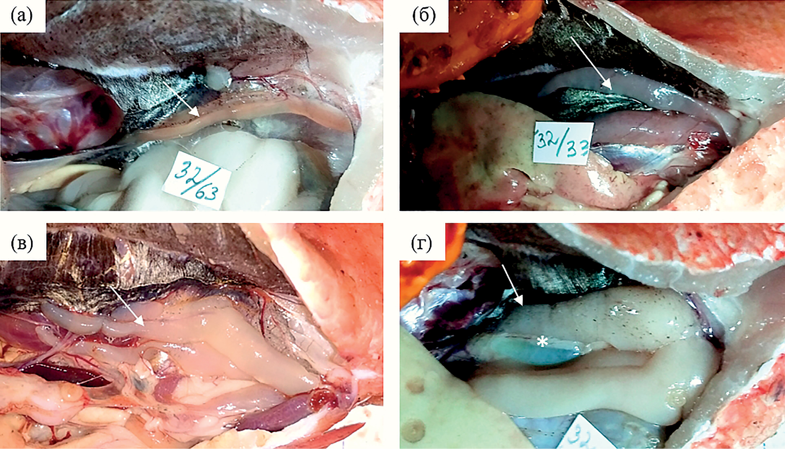 Рис. 2. Семенники тихоокеанского окуня-клювача Sebastes alutus разных стадий зрелости: а – II, б – II–III, в – III, г – IV–V: (*) – семяпровод, заполненный сперматозоидами.