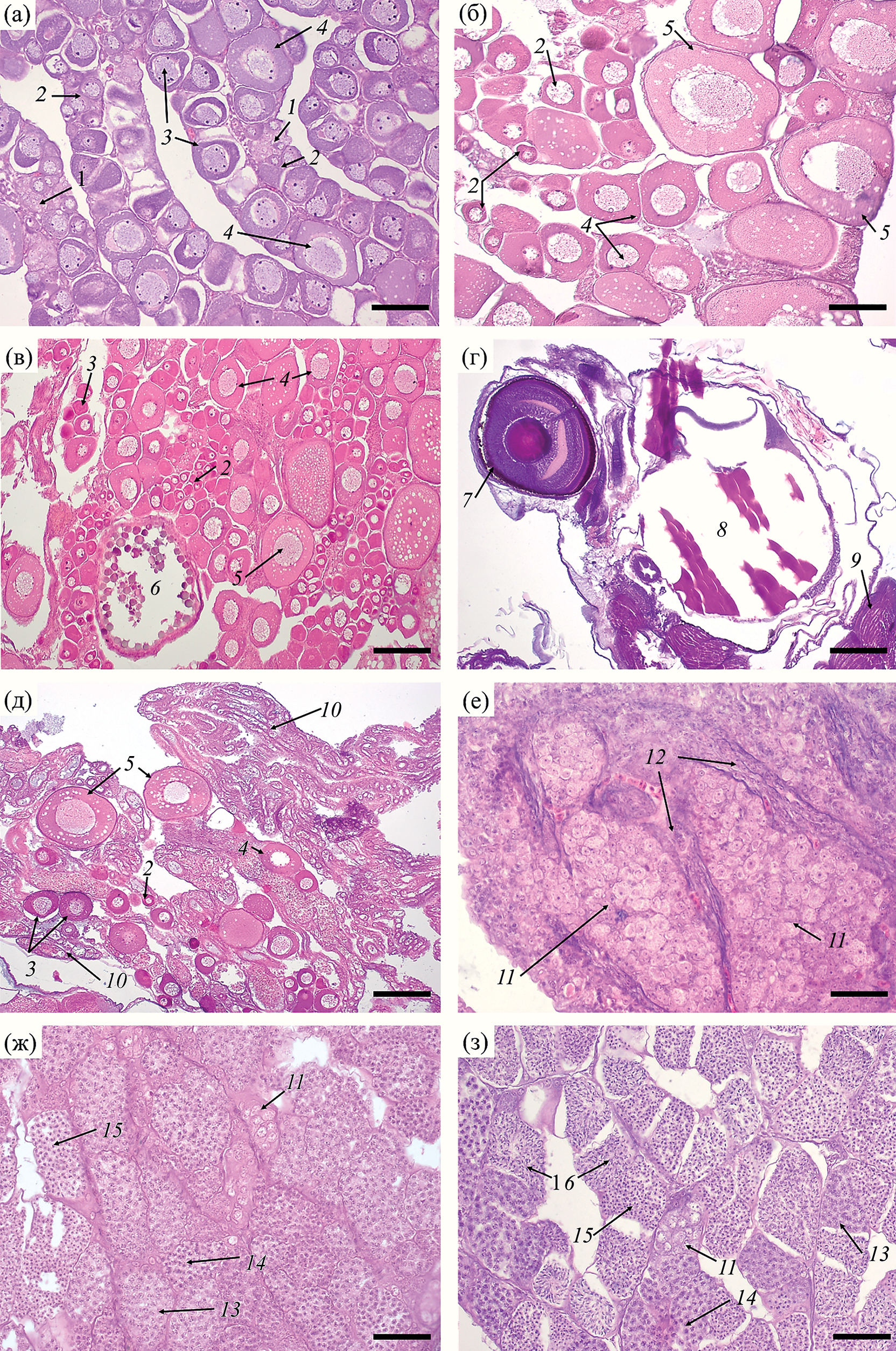 Рис. 3. Яичники (а–д) и семенники (е–з) тихоокеанского окуня-клювача Sebastes alutus стадий зрелости II (а, е), II–III (б, ж), III (в, з), VIII (г), IX (д): 1 – оогонии; 2–4: фазы превителлогенеза: 2 – ранняя, 3 – средняя, 4 – поздняя; 5 – фаза вакуолизации, 6 – фаза вителлогенеза, 7 – глаз, 8 – желток, 9 – мускулатура эмбриона, 10 – опустевшие фолликулы, 11 – сперматогонии, 12 – соединительнотканные элементы гонады; 13, 14 – сперматоциты I и II порядка; 15 – сперматиды, 16 – сперматозоиды. Масштаб, мкм: а, б – 100, в–д – 200, е–з – 50.