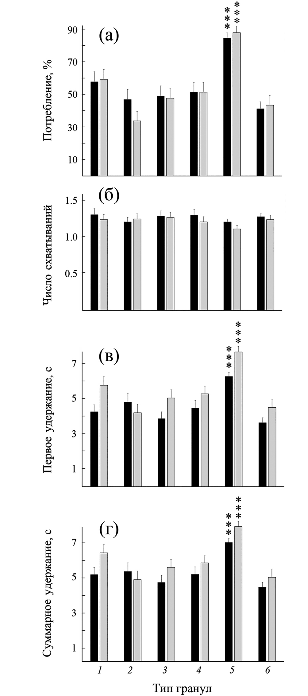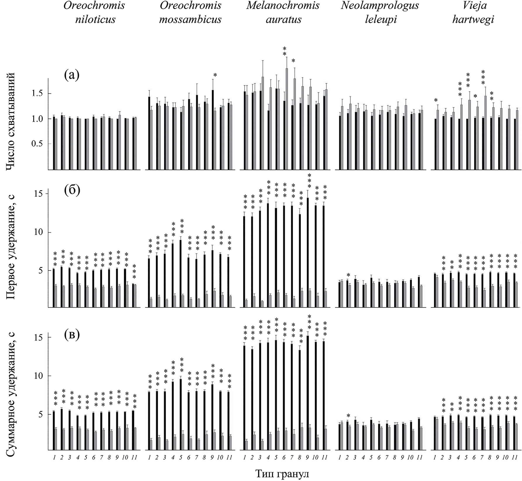 Оросенсорное тестирование гранул различается в опытах, завершающихся проглатыванием гранулы (ПГ-опыты), и в опытах, в которых гранула в итоге отвергается (ОГ-опыты). Различие между этими двумя возможными вариантами опытов по числу схватываний гранулы не больше, чем в 1.2–1.4 раза. У цихлазомы Хартвега достоверные различия найдены для шести типов гранул, у мозамбикской тиляпии и золотого меланохрома соответственно у одного и двух типов гранул, у нильской тиляпии и апельсинового неолампрологуса такие различия отсутствуют (рис. 2а).
