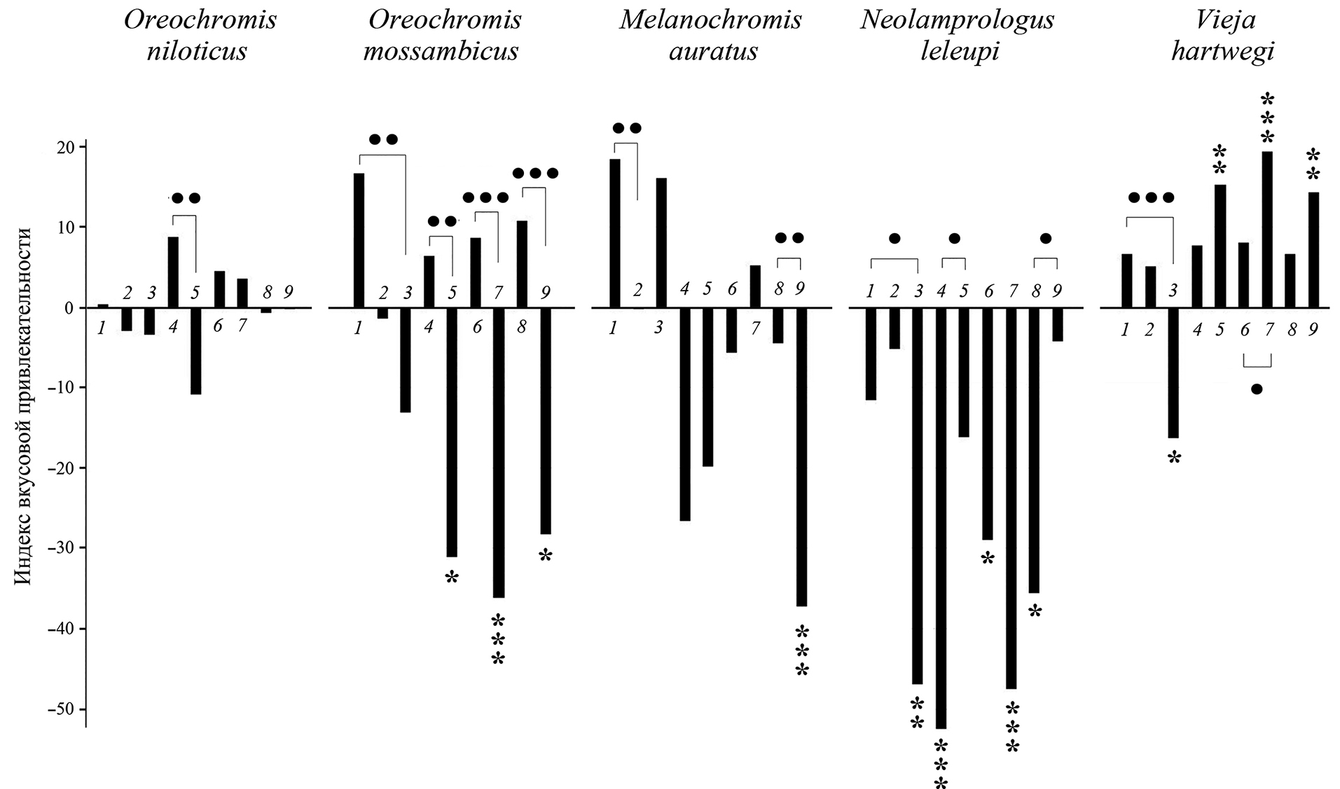 Рис. 3. Индекс вкусовой привлекательности изомеров аминокислот для нильской Oreochromis niloticus и мозамбикской O. mossambicus тиляпий, золотого меланохрома Melanochromis auratus, апельсинового неолампрологуса Neolamprologus leleupi и цихлазомы Хартвега Vieja hartwegi. Различия потребления гранул с разными веществами достоверны при р: ● < 0.05, ●● < 0.01, ●●● < 0.001; ост. обозначения см. на рис. 1.
