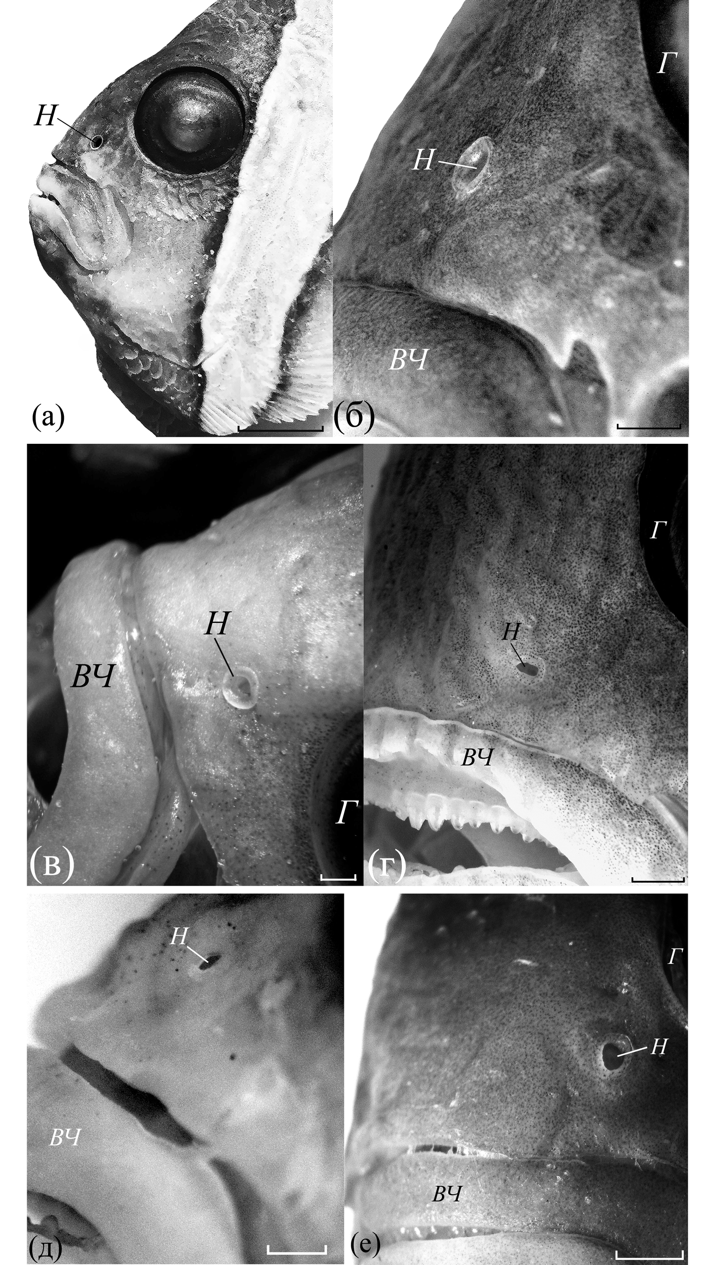 Рис. 1. Расположение органа обоняния у амфиприонов: а, б – Amphiprion clarkii TL 11.0 см; в – A. polymnus TL 8.7 см, г – A. frenatus TL 9.7 см, д – A. ocellaris TL 5.3 см; е – A. perideraion TL 8.0 см, вид слева сверху. Здесь и на рис. 2: Н – ноздря; Г – глаз; ВЧ – верхняя челюсть. Масштаб, мм: а – 5.0; б, г, д – 1.0; в – 0.5; е – 2.0.