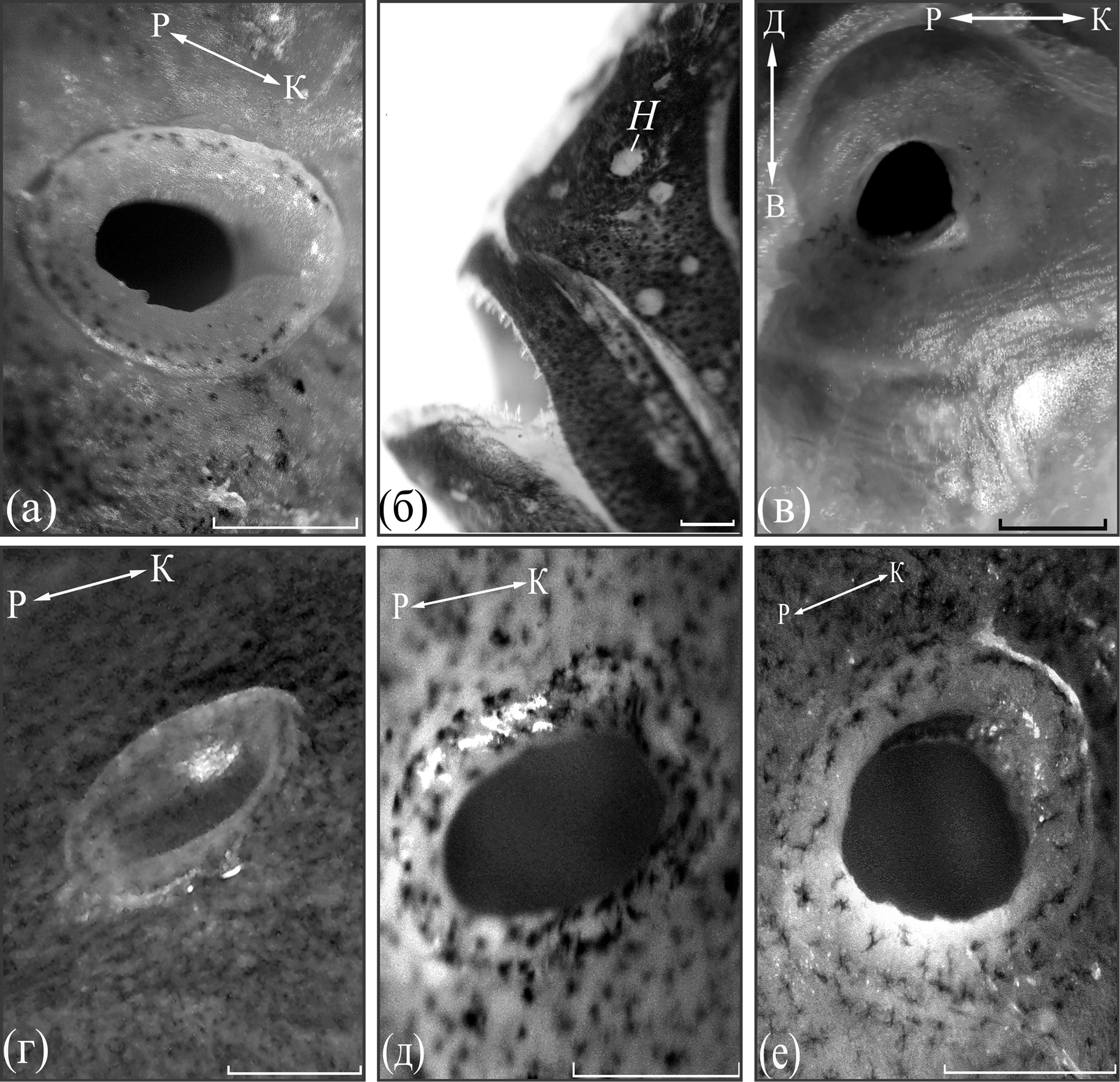 Рис. 2. Ноздря у амфиприонов: а, б – A. polymnus TL 12.5 и 2.43 см; в – A. polymnus TL 14.0 см, вид со стороны обонятельной полости; г – Amphiprion clarkii TL 11.0 см; д – A. frenatus TL 9.7 см; е – A. perideraion TL 8.0 см. Направления (↔): Д–В – дорсовентральное, Р–К – рострокаудальное. Масштаб: 0.5 мм.