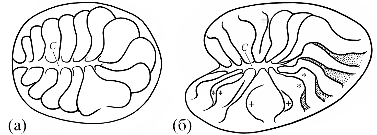 Рис. 3. Схема обонятельной розетки Amphiprion clarkii (а) и A. polymnus (б): С – септа центральной складки; складки: (*) – раздвоенные, (+) – не связанные с септой.