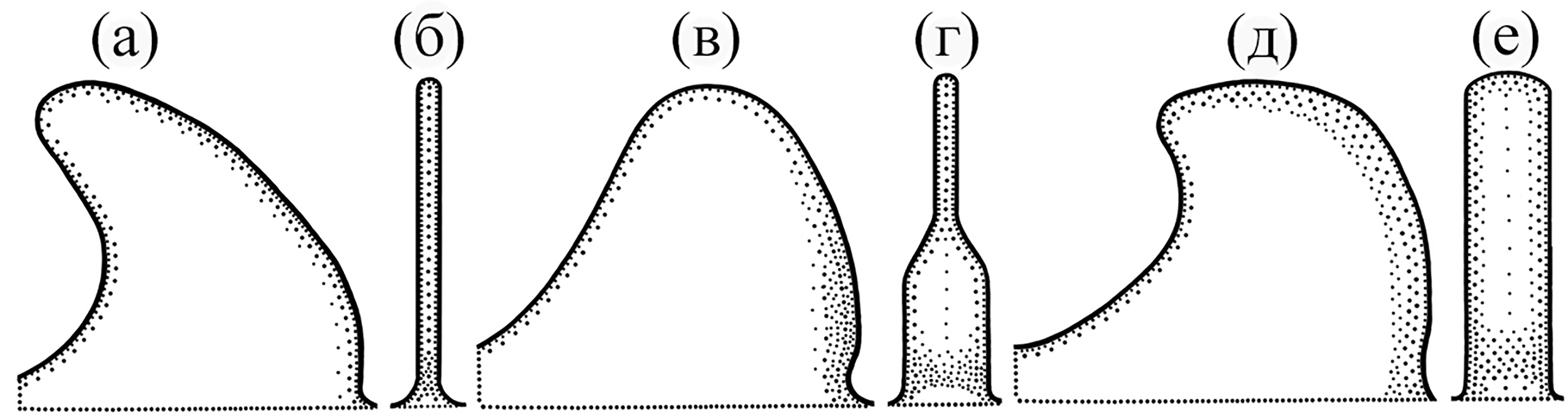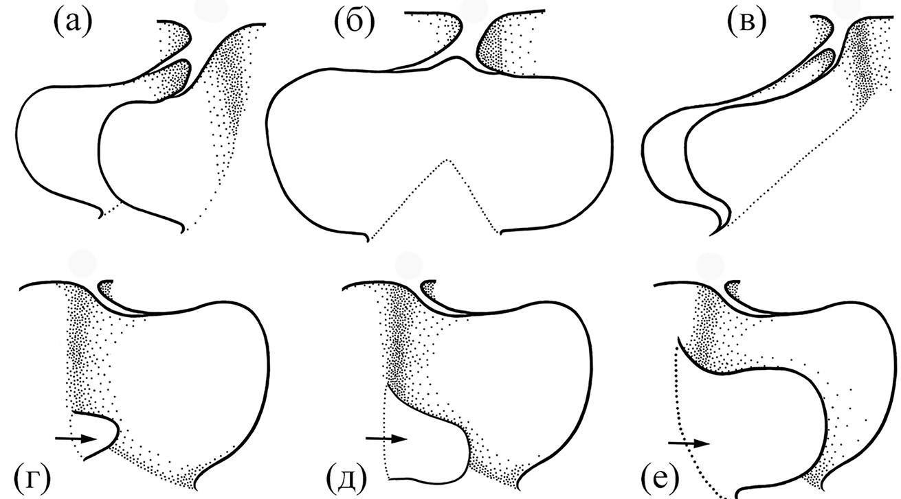 Рис. 5. Форма складок, располагающихся в каудальной части обонятельной розетки: а, б – Amphiprion clarkii, A. frenatus и A. ocellaris; в, г – A. polymnus; д, е – A. perideraion; а, в, д – вид складки сбоку; б, г, е – вертикальный профиль складки.