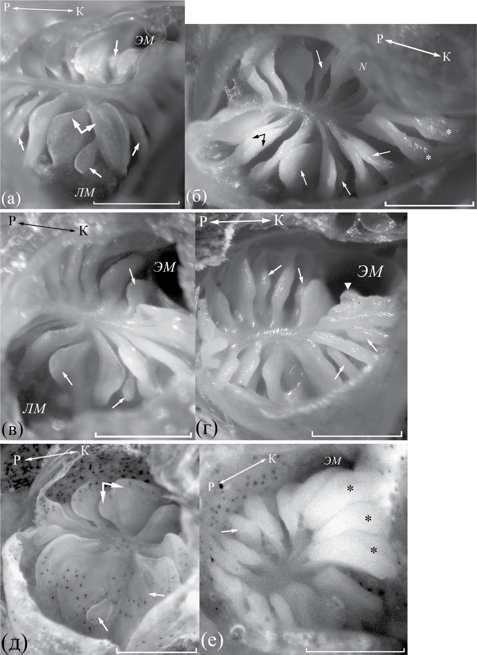 Рис. 6. Нетипичные складки в обонятельной розетке Amphiprion polymnus: а, б – горизонтально дихотомические складки с соответственно узко и широко расходящимися лопастями; в – вертикально дихотомическая складка, г–е – интеркалярная складка (→) на разных стадиях формирования.