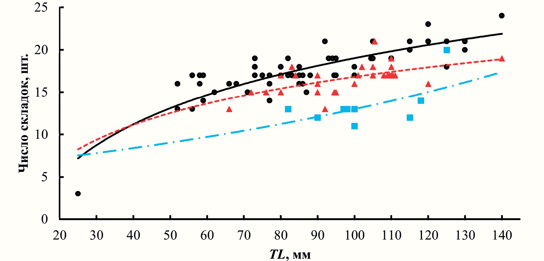 TL, см | Дихотомические складки | Интеркалярные складки | n | ||||||||