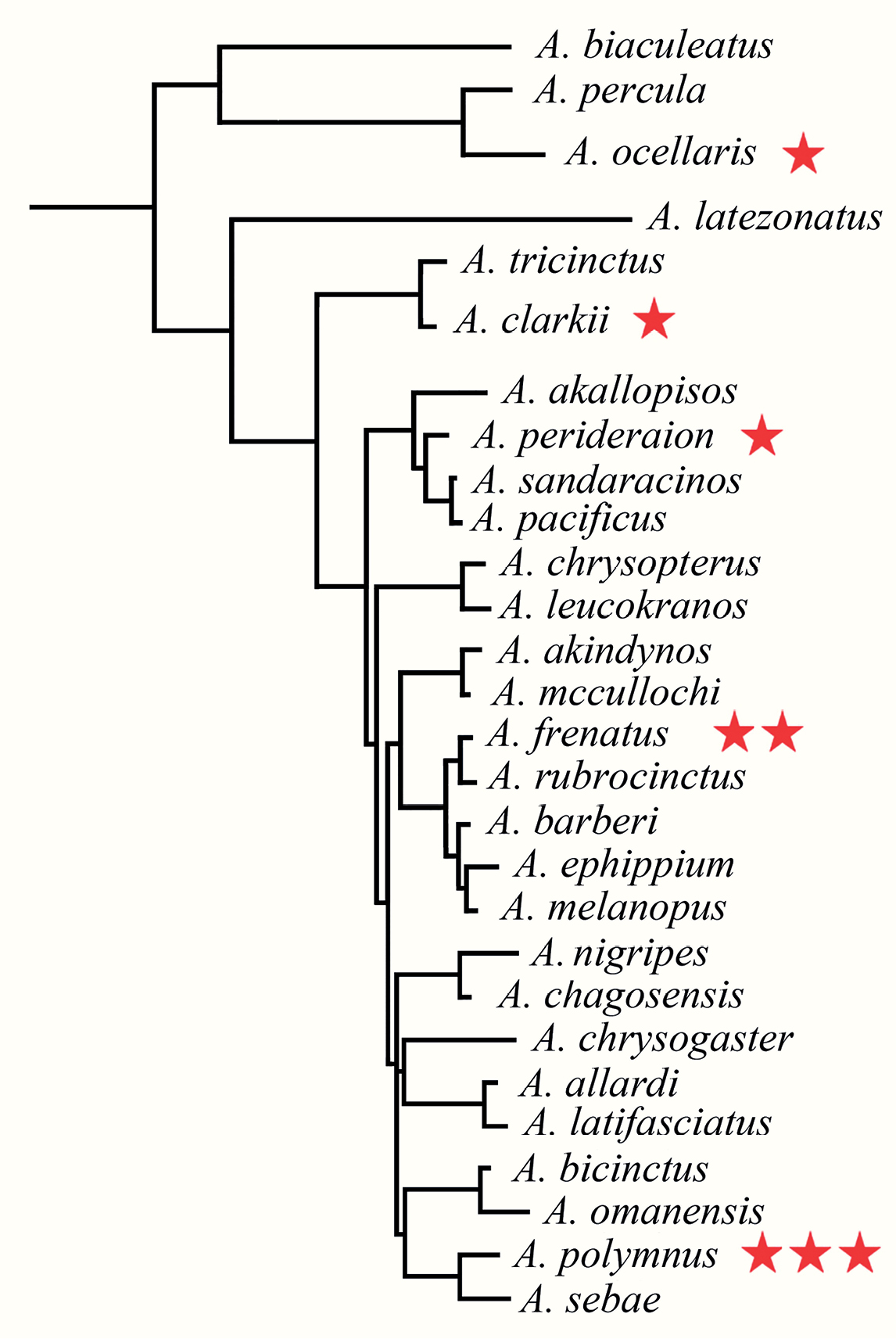 Рис. 9. Филогенетические отношения рыб рода Amphiprion (по: Tang et al., 2021); увеличение числа звёздочек (★) отражает морфологическое усложнение органа обоняния у исследованных видов.