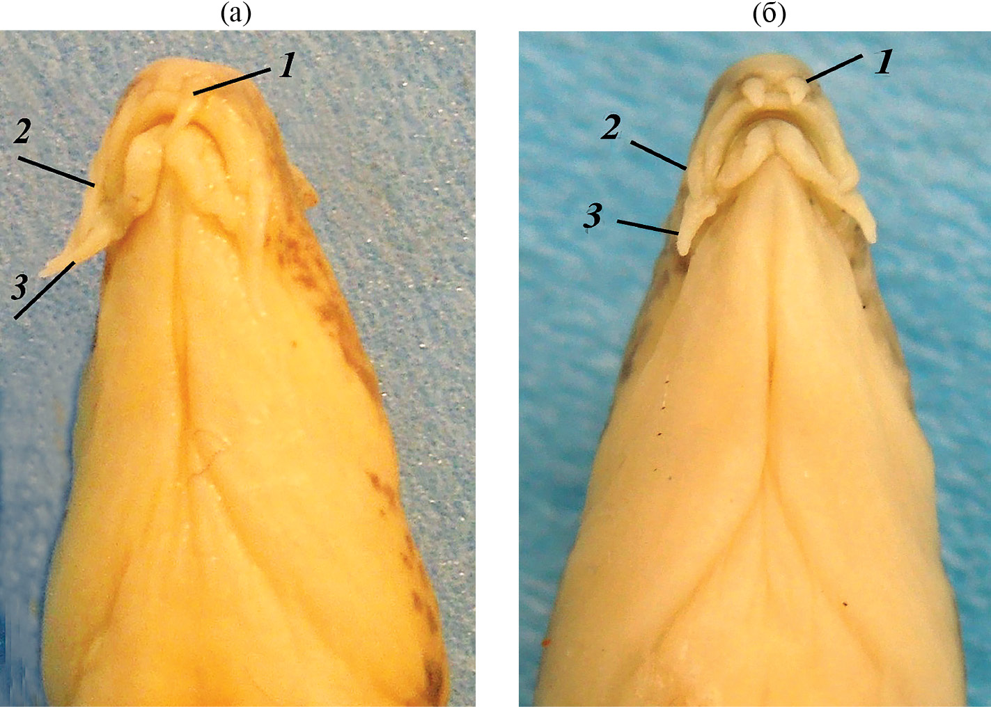 Рис. 2. Щиповки рода Cobitis из водоёмов Колхидской низменности; голова, вид снизу: а – самка SL 82.5 мм ЗММУ Р-24566, р. Сепа; б – самка SL 69.0 мм ЗММУ Р-24570, неотип Cobitis osurgeticus, р. Натанеби. Усики: 1 – ростральные, 2 – максиллярные, 3 – мандибулярные.