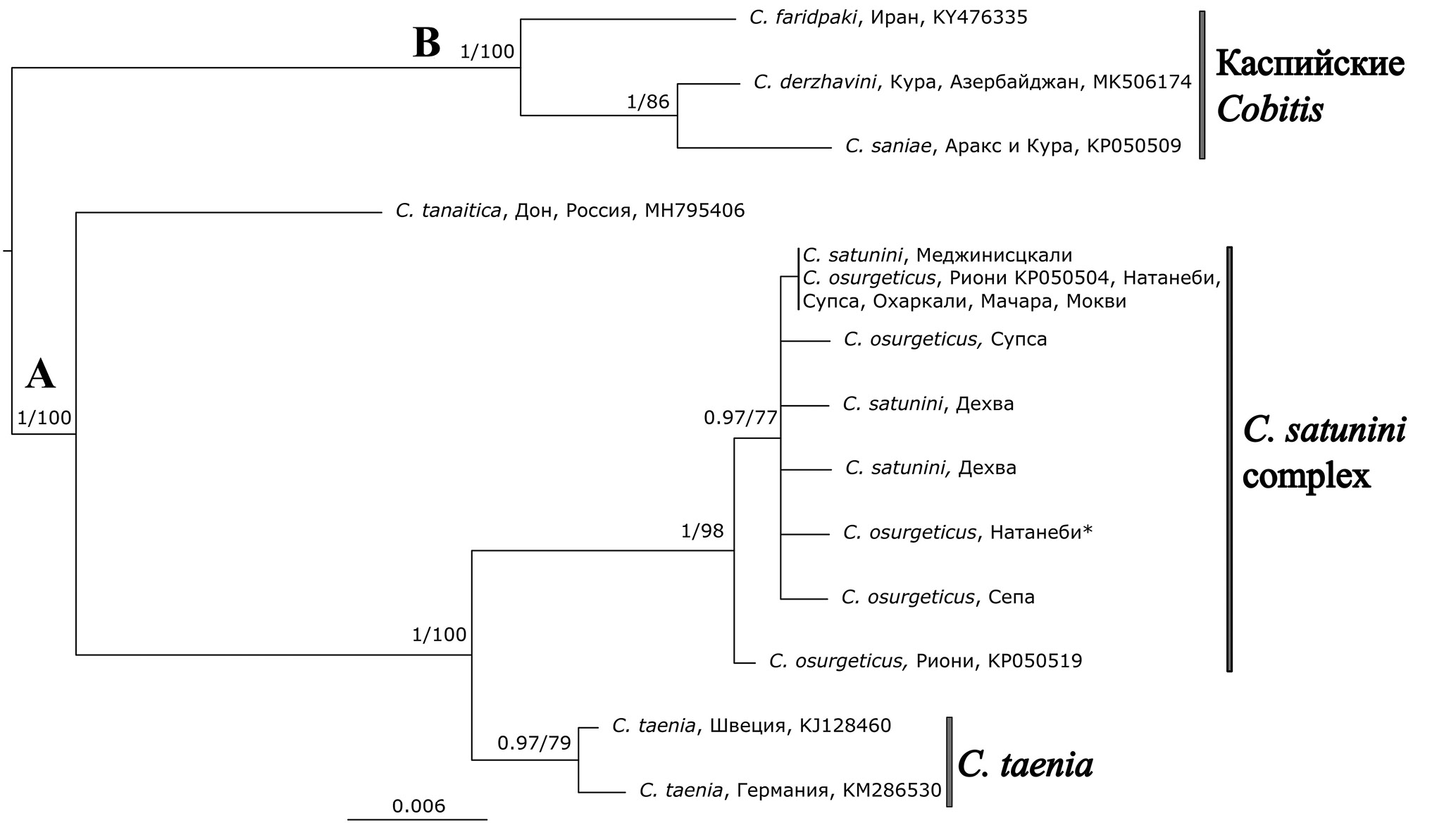 Рис. 9. Консенсусное филогенетическое дерево, построенное методом байесовской вероятности (BI) на основе набора данных COI для щиповок Cobitis Закавказья и видов, обитающих в Иране и Восточной Европе. В узлах дерева до черты указаны значения апостериорной вероятности для метода BI, после черты – значения бутстрепа для метода максимального правдоподобия (ML). Клады: A – европейско-черноморская (с подкладой Cobitis satunini complex), B – каспийская; *неотип C. osurgeticus. Для отдельных видов указаны имеющиеся в международной базе данных Генбанка (https://www.ncbi.nlm.nih.gov/) номера последовательностей гена COI. Масштаб длины ветвей указан в ожидаемых заменах на сайт.