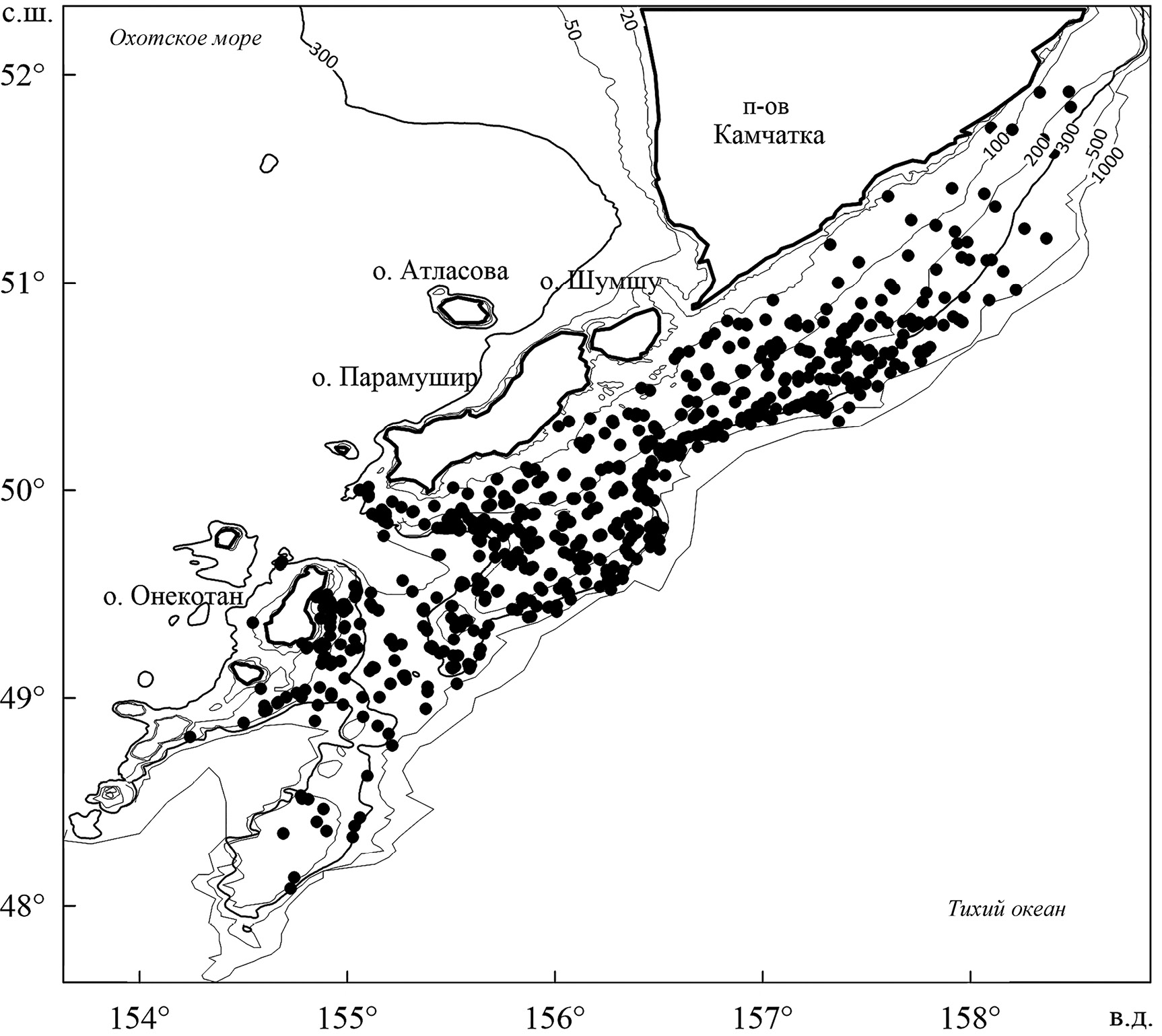 Северная двухлинейная камбала, обитающая в районе тихоокеанского побережья северных Курильских островов и Юго-Восточной Камчатки, была объединена в единую популяционную группировку также согласно местоположению локальных скоплений, пространственно связанных между собой (Бирюков, 2008; Промысел биоресурсов…, 2013). В тёплый период года скопления камбал были отмечены на глубинах 50–150 м при преимущественной температуре 0–1.6°C, а с похолоданием рыбы перемещались на глубины 150–260 м, где пределы варьирования температуры воды уменьшались до 0–0.7°C. По другой информации, зимой камбалы придерживались зоны свала глубин 225–350 м, летом – 100–175 м (Золотов и др., 2012). Нерест в основном отмечали в феврале–апреле на участках зимовальных скоплений либо в непосредственной близости от них. В целом в районе исследований были выделены, так же как у трески, северное (Юго-Восточная Камчатка) и южное (о. Парамушир) скопления, но между ними могло присутствовать и так называемое срединное скопление, что создавало картину непрерывного распределения рыб в районе (Бирюков, 2008; Орлов, 2010; Золотов и др., 2012). Характерным для данной популяции камбал считали отсутствие значимых сезонных перемещений рыб во вдольбереговом направлении. Наши исследования продемонстрировали сильную вариабельность в сезонном распределении камбал, но присутствие двух–трёх отдельных её зимовальных скоплений также было выявлено. В нагульный период года характерным явлением оказывалась высокая концентрация рыб в прибрежье о-ва Онекотан, о чём в предыдущих публикациях не упоминалось.