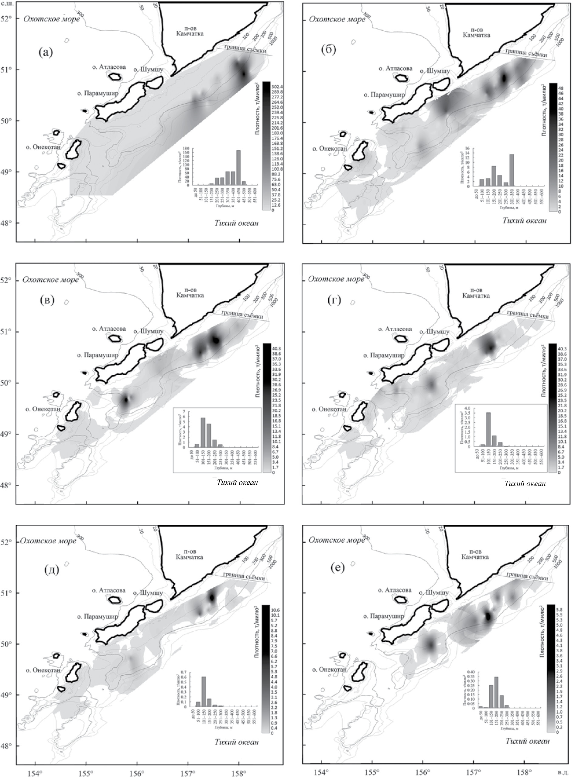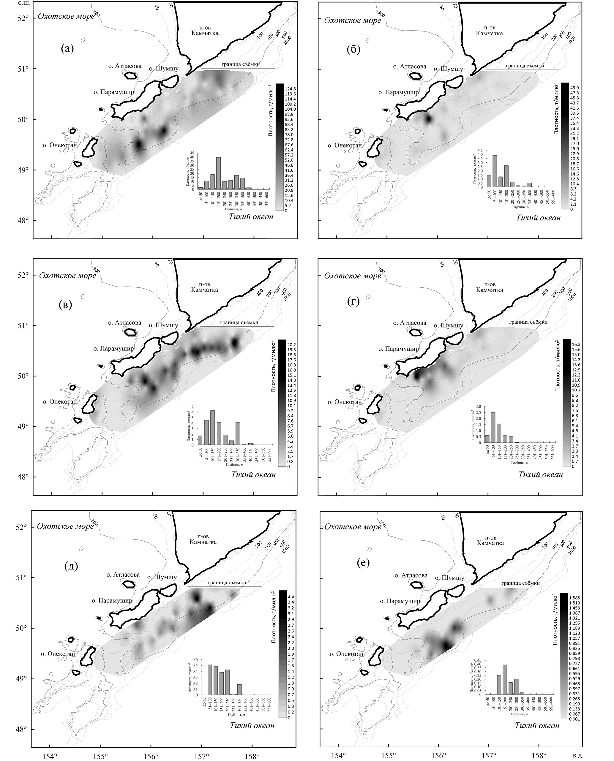 Минтай был распределён на склоне в диапазоне глубин 200–350 м (рис. 5а). Скопления вида с повышенной плотностью формировались на двух участках – на траверзе юго-восточной оконечности Камчатки, представляя край северного скопления, и на склоне выступающего плато южнее о-ва Парамушир. Треска образовывала основное скопление вдоль склона у о-вов Шумшу и Парамушир на глубинах 100–300 м (рис. 5б). Многочисленная двухлинейная камбала концентрировалась на южном плато непосредственно напротив о-ва Парамушир на глубине 100–250 м (рис. 5в). Оконтуренная часть скопления камбал на северной границе съёмки указывала на присутствие ещё одного скопления севернее 51° с. ш. у Юго-Восточной Камчатки. Белобрюхий получешуйник формировал несколько отдельных скоплений, распределённых вдоль всего о-ва Парамушир, ещё одно скопление вида было краем оконтурено на северной границе съёмки (рис. 5г). Глубины обитания рыб ограничивались значениями 50–250 м. Многочисленный узколобый шлемоносец формировал отдельное скопление на южном плато на глубинах 150–250 м (рис. 5д). Ещё один вид – широколобый шлемоносец G. detrisus – концентрировался схожим образом, формируя ряд скоплений к северу, вплоть до границы съёмки на глубинах 50–200 (максимум 250) м (рис. 5е).