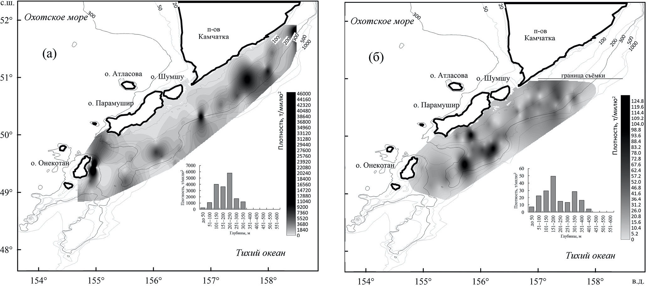 Белобрюхий получешуйник концентрировался вблизи Первого и Второго Курильских проливов, причём всё ещё на шельфе и приграничной склоновой зоне в пределах глубин до 150 м (рис. 14д). Отдельные скопления сохранялись в океанских водах у о-ва Онекотан, что, возможно, связано с более поздними по времени зимовальными миграциями вида. В основном рыбы находились в диапазоне глубин 50–200 м, хотя часть из них продвинулась уже до 300 м. Примерно такое же распределение было характерно осенью для многоиглого керчака (рис. 14е). Находясь на траверзе Первого Курильского пролива, керчак был распределён более широко, концентрируясь на глубинах 50–350 м.