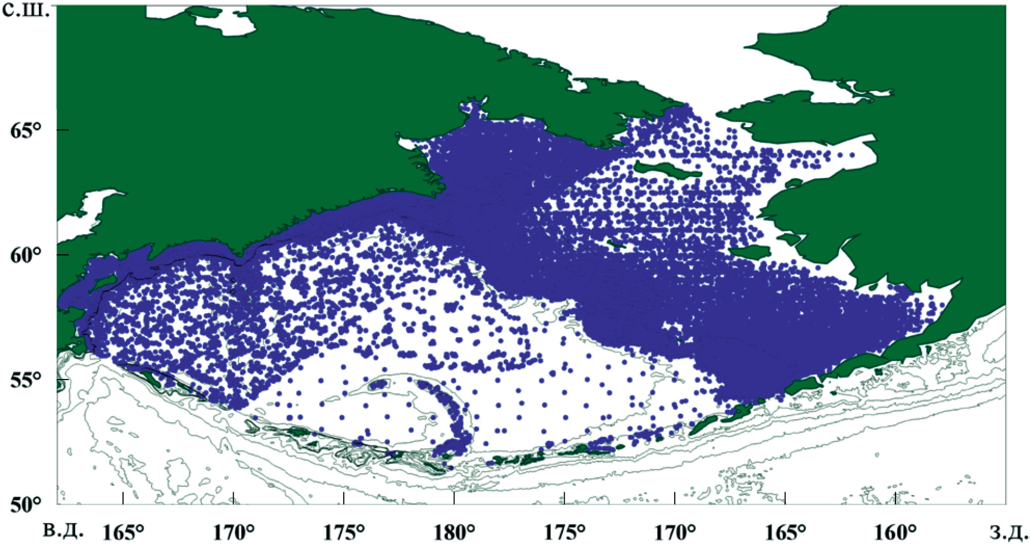 Рис. 2. Горизонтальное распределение станций научных и промысловых экспедиций ТИНРО в Беринговом море в 1963–2020 гг.: (·) – траления с горизонтом хода трала 0–1200 м.