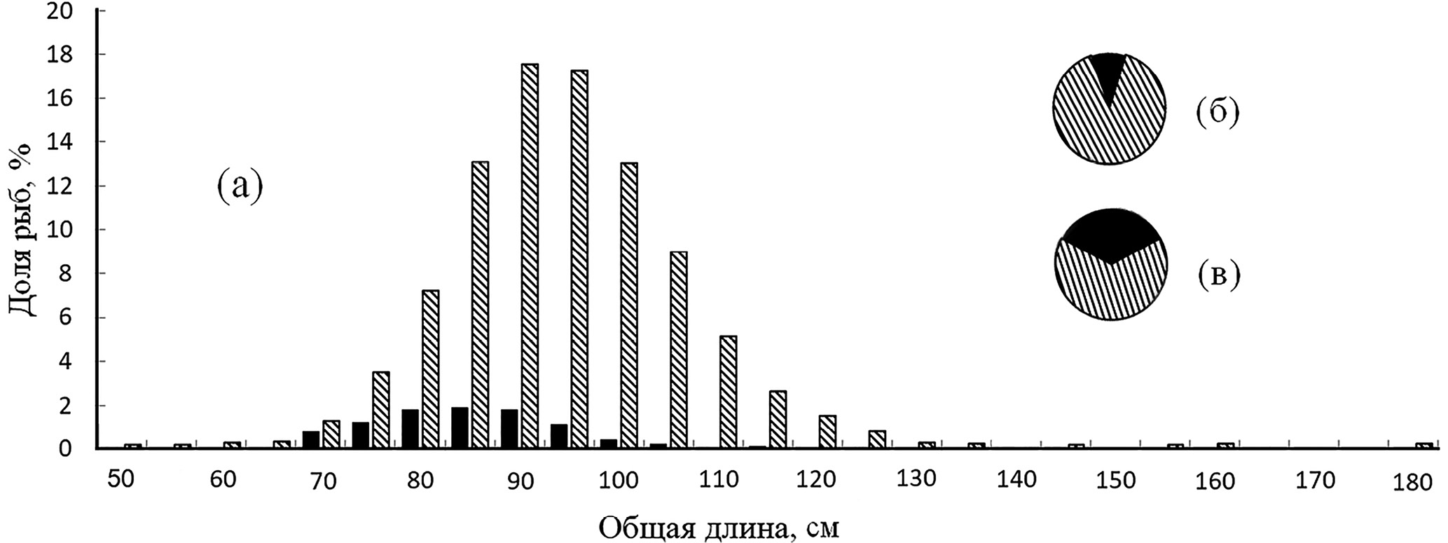 Рис. 6. Размерный состав (а), а также соотношение полов у всех рыб (б) и у особей с гонадами V стадии зрелости (в) малоглазого макруруса Coryphaenoides pectoralis в уловах донного трала в Беринговом море: (∎) – самцы (средняя общая длина 55.3 см), (⛞) – самки (88.1 см).