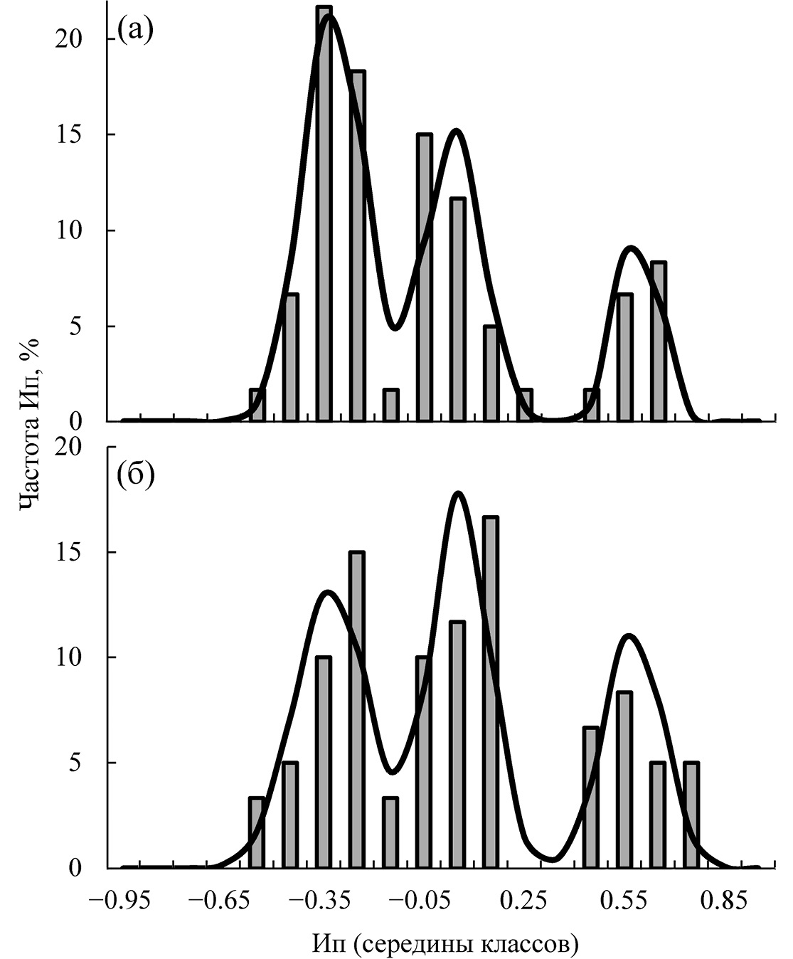 Рис. 3. Частотное распределение индивидуальных значений индекса перемещения (Ип) во 2-й фазе ответа рыб на голодание: а – карась Carassius gibelio (10 сут голодания), б – данио Danio rerio (12 сут); (¾) – фактические частоты, (―) – суммарная плотность трёх теоретических нормальных распределений, построенных по выборочным параметрам. Тримодальное распределение по критерию Лиллиефорса достоверно отличается от бимодального у карася при р = 0.002, у данио при р < 0.0001.