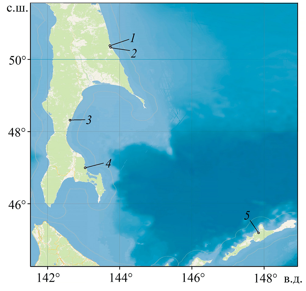 Рис. 1. Схема расположения пунктов учёта покатной молоди горбуши Oncorhynchus gorbuscha в реках на восточном побережье о-ва Сахалин (1–4) и на о-ве Итуруп (5): 1 – Большая Хузи, 2 – Малая Хузи, 3– Лазовая, 4 – Вознесенка, 5 – Рыбацкая.