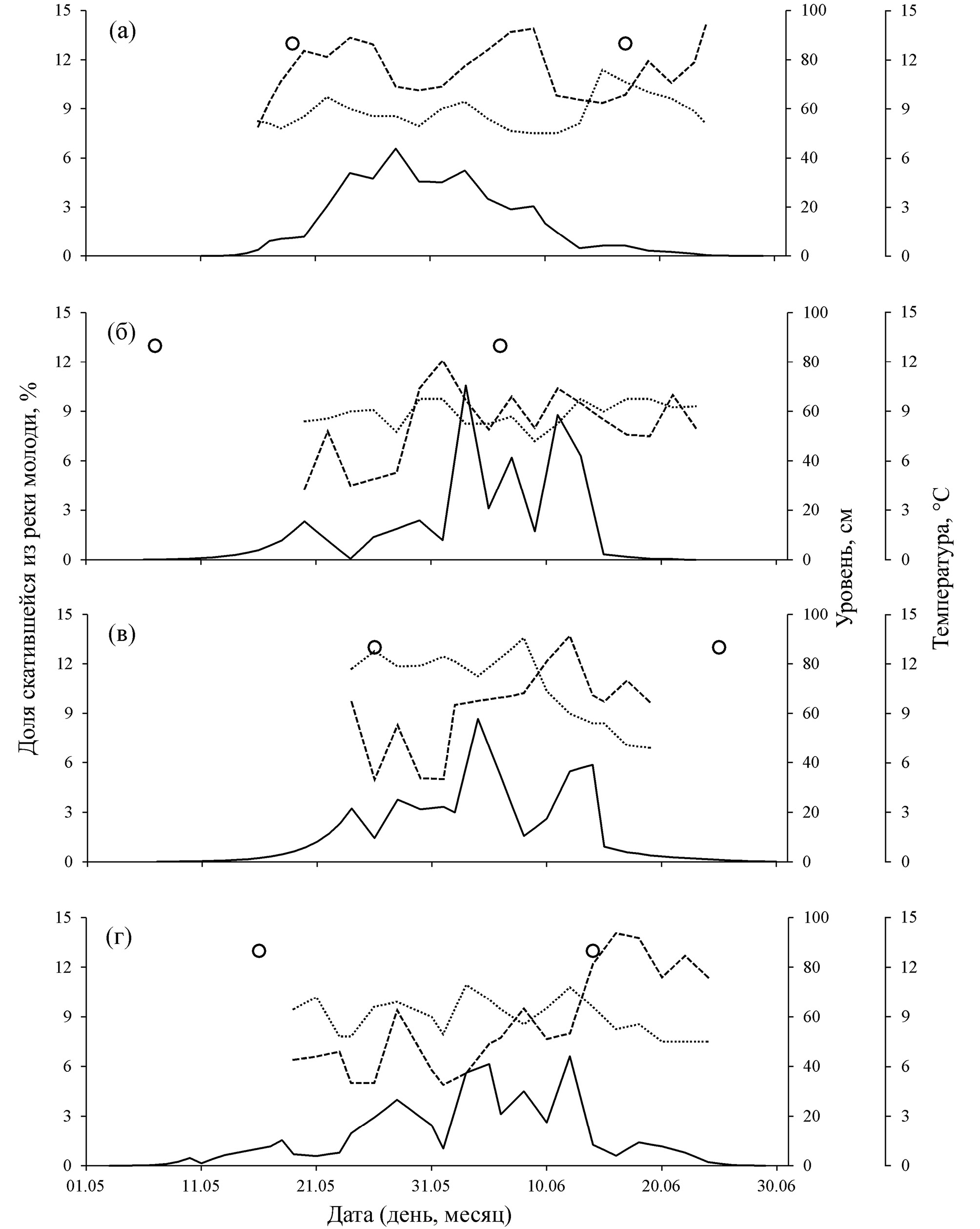 Рис. 4. Динамика покатной миграции молоди горбуши Oncorhynchus gorbuscha, температуры и уровня воды в р. Вознесенка в мае–июне 2014 (а), 2015 (б), 2019 (в) и 2020 (г) гг.