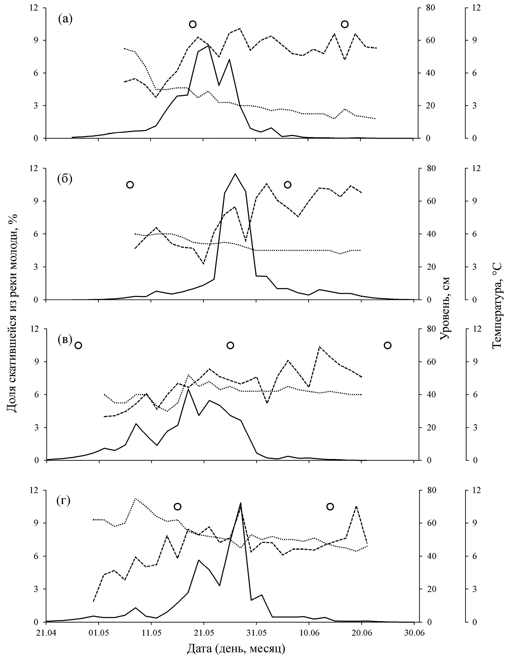 Рис. 5. Динамика покатной миграции молоди горбуши Oncorhynchus gorbuscha, температуры и уровня воды в р. Рыбацкая в апреле–июне 2019 (а), 2020 (б), 2021 (в) и 2022 (г) гг.