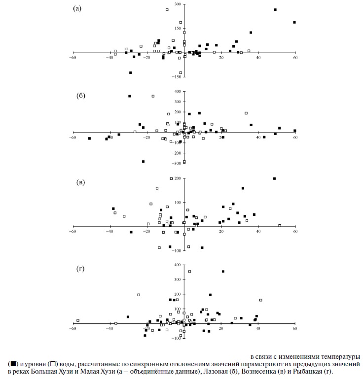 Во всех массивах данных, полученных при сопоставлении величин синхронных отклонений текущих значений признаков от их предыдущих значений, происходивших на фазе подъёма численности покатной молоди, не выявлено сколь-нибудь заметных тенденций, свидетельствующих о влиянии температурного и уровневого режимов в каждой из изученных рек на динамику ската в них молоди горбуши, за исключением температуры воды в реках “Хузи” (рис. 6).